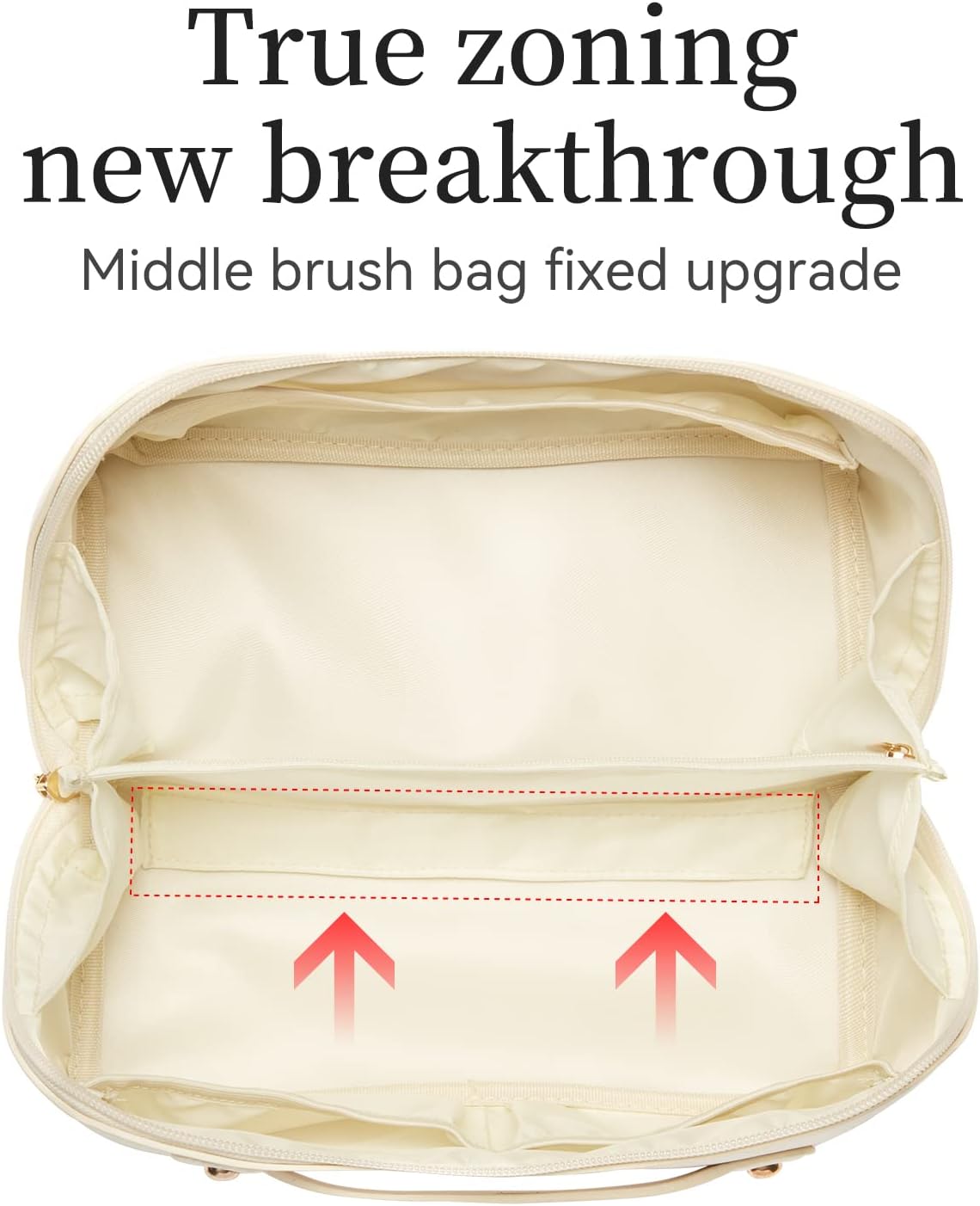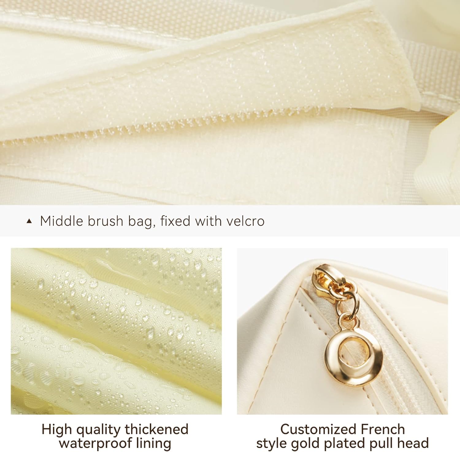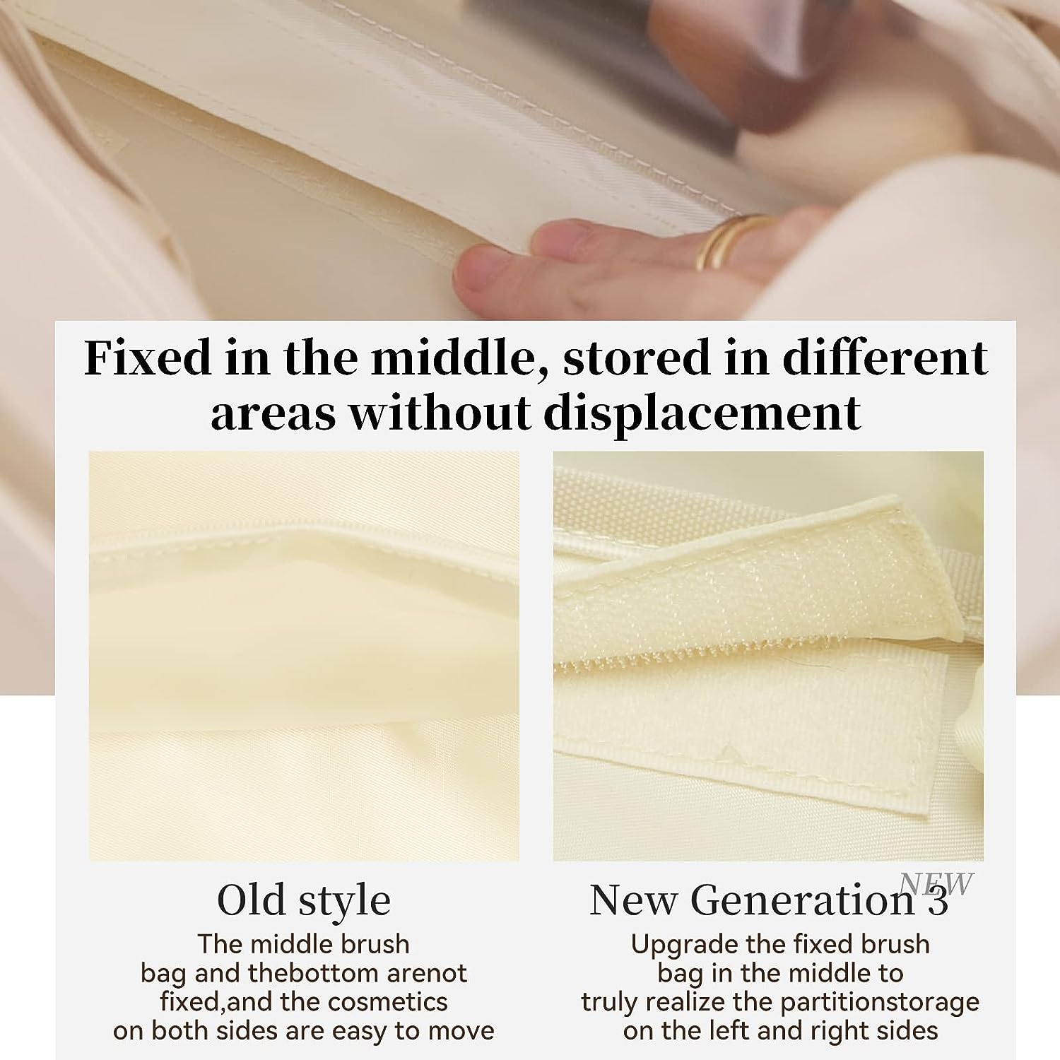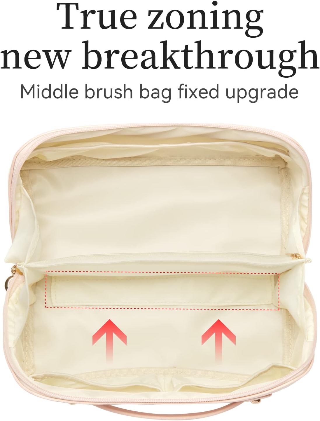 • 【Large opening, partition storage】Open the cosmetic bag. There are one storage compartment on the left and right sides, which can place large cosmetic products. There is a brush storage bag in the middle, which can place cosmetic brushes. There are small storage bags on both sides, which can place other cosmetic products. The large opening is convenient to use and clear at a glance