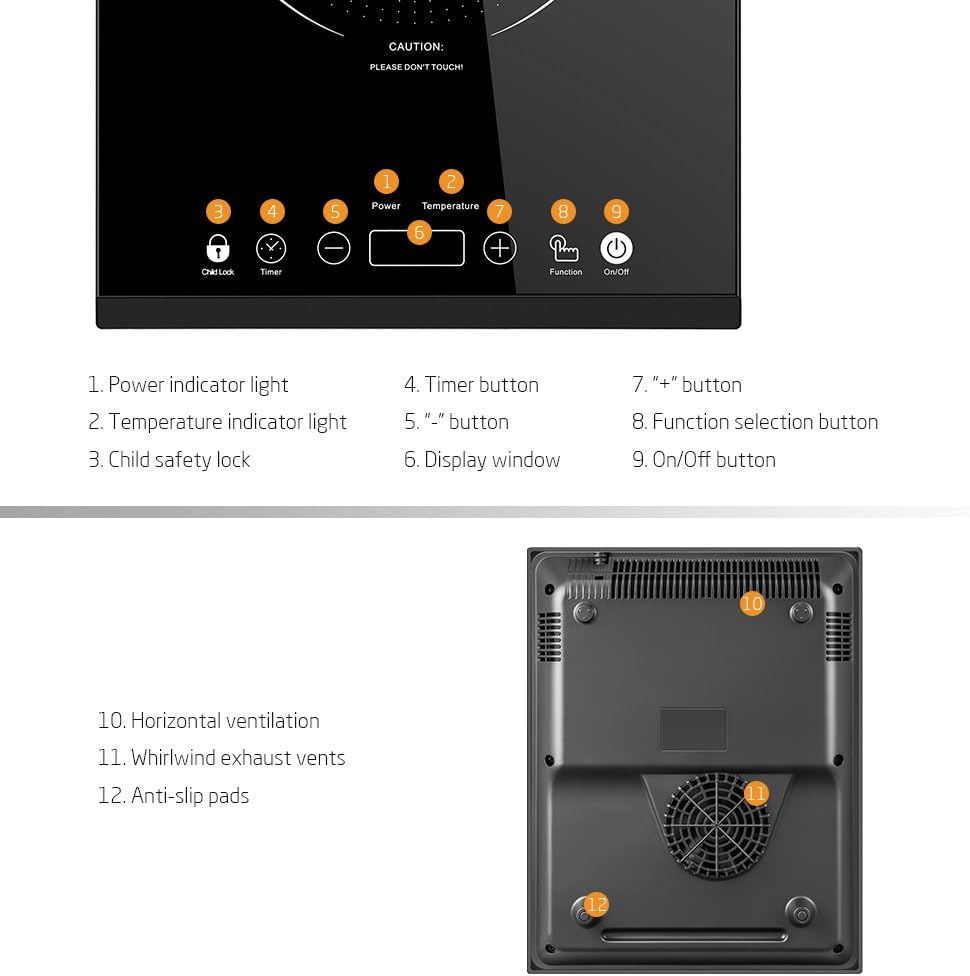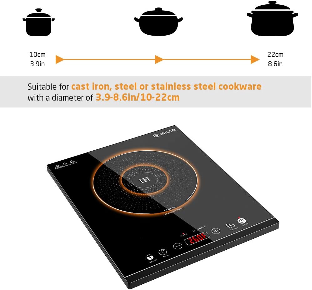 • WIDE APPLICATIONS & PORTABLE: The cooktop surface measures a diameter of 6.7in (17cm) to fit frying pans with a diameter of 3.9-8.6in (10-22cm); ensures a large and uniform heated area; compact and lightweight with a thickness of just 2.3in (6cm) for easy transport and storage; suitable for areas with limited space use.