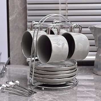 7.5oz Espresso Cup Set of 4, Ceramic Coffee Cup Set with Saucers, Spoons and Stainless Steel Metal Stand for Cappuccino, Latte, Tea and Milk (Grey)