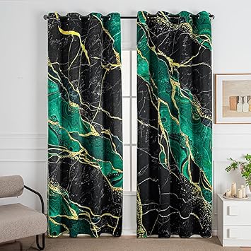 Green Marble Blackout Curtains 84 in Long 2 Panels Modern Luxury Thermal Insulated Darkening Curtains Gold Foil Cracked Lines Crystal Texture Window Drape for Bedroom Living Room Decor, 52" �Ê 84"