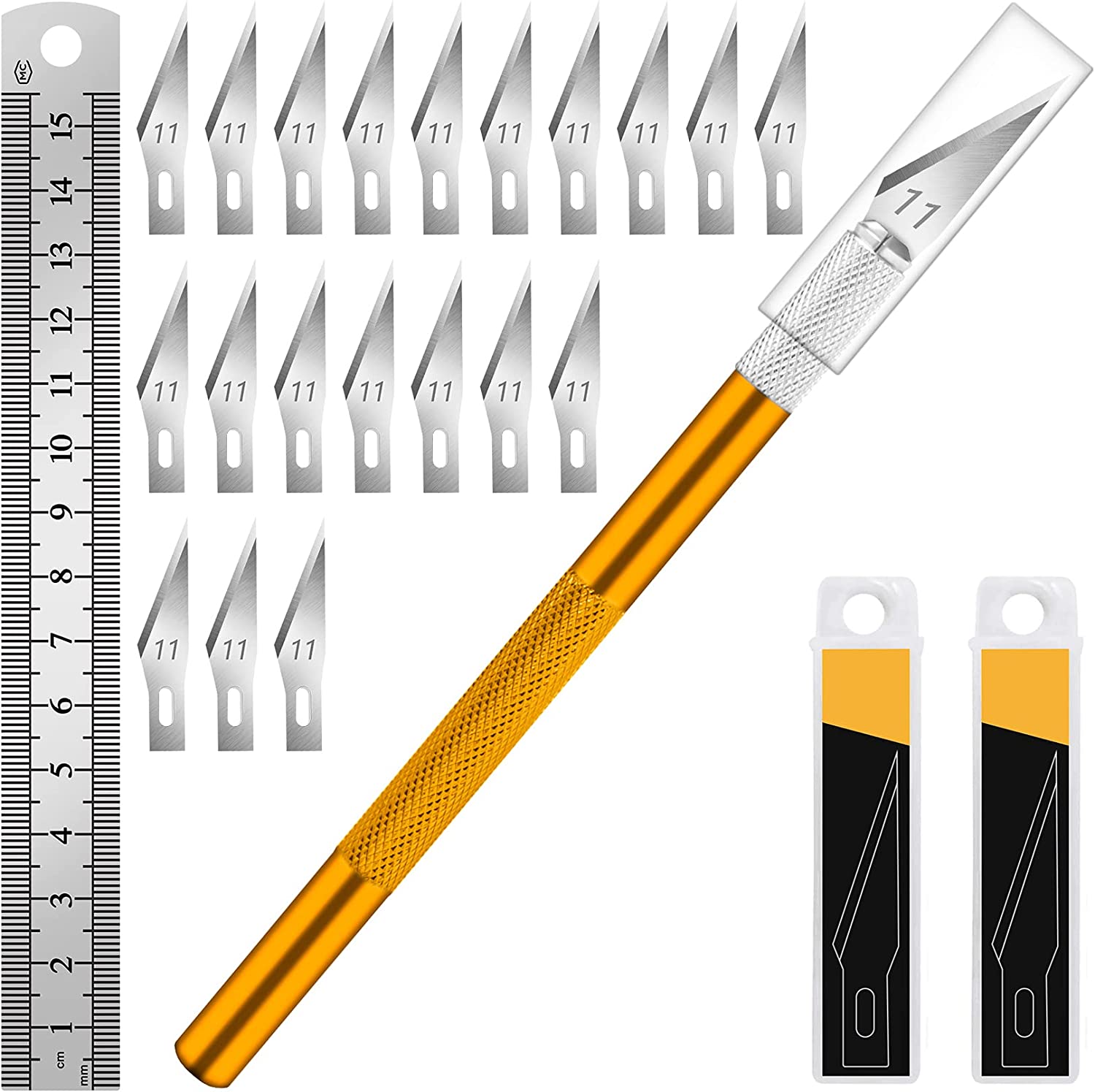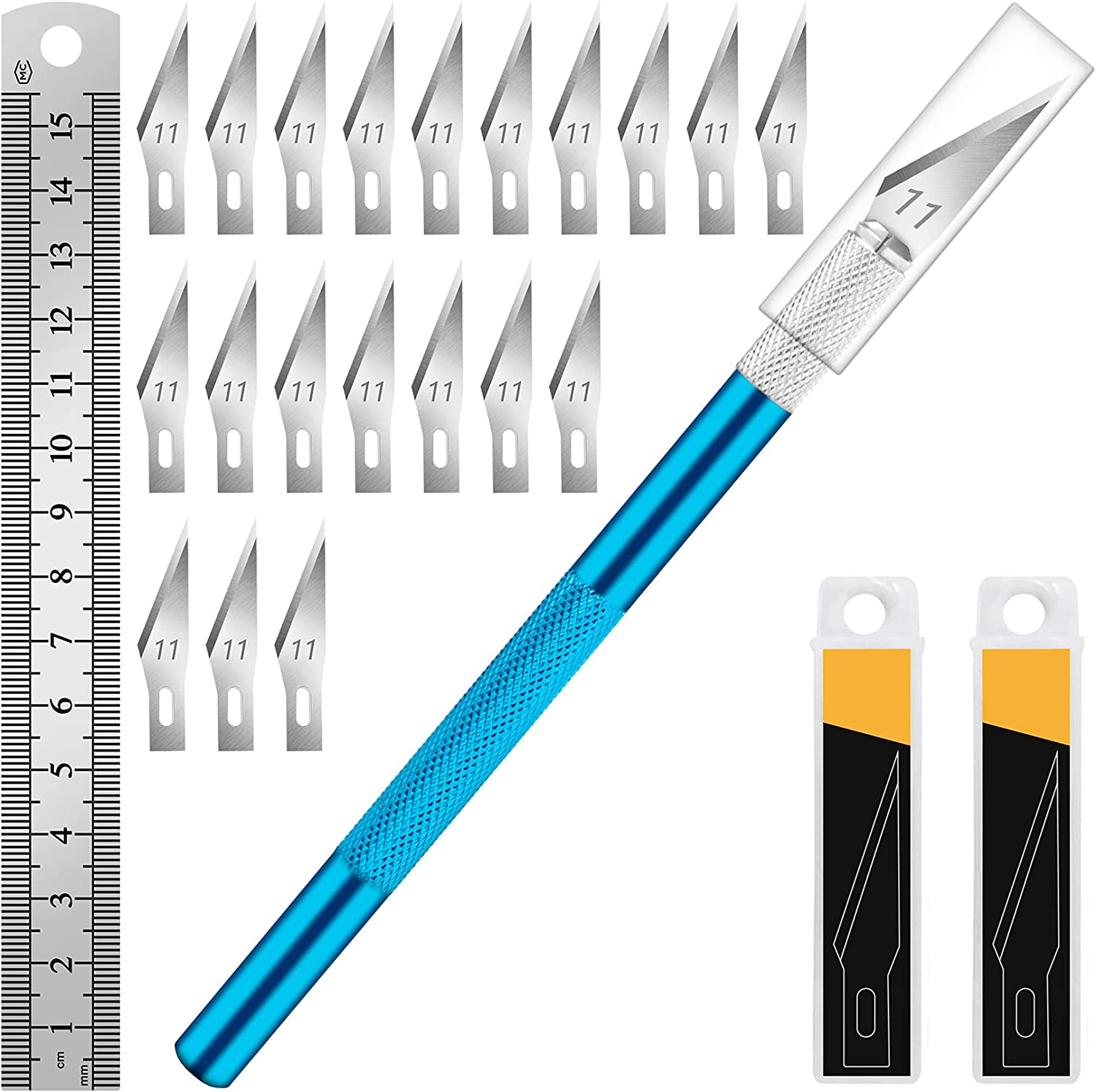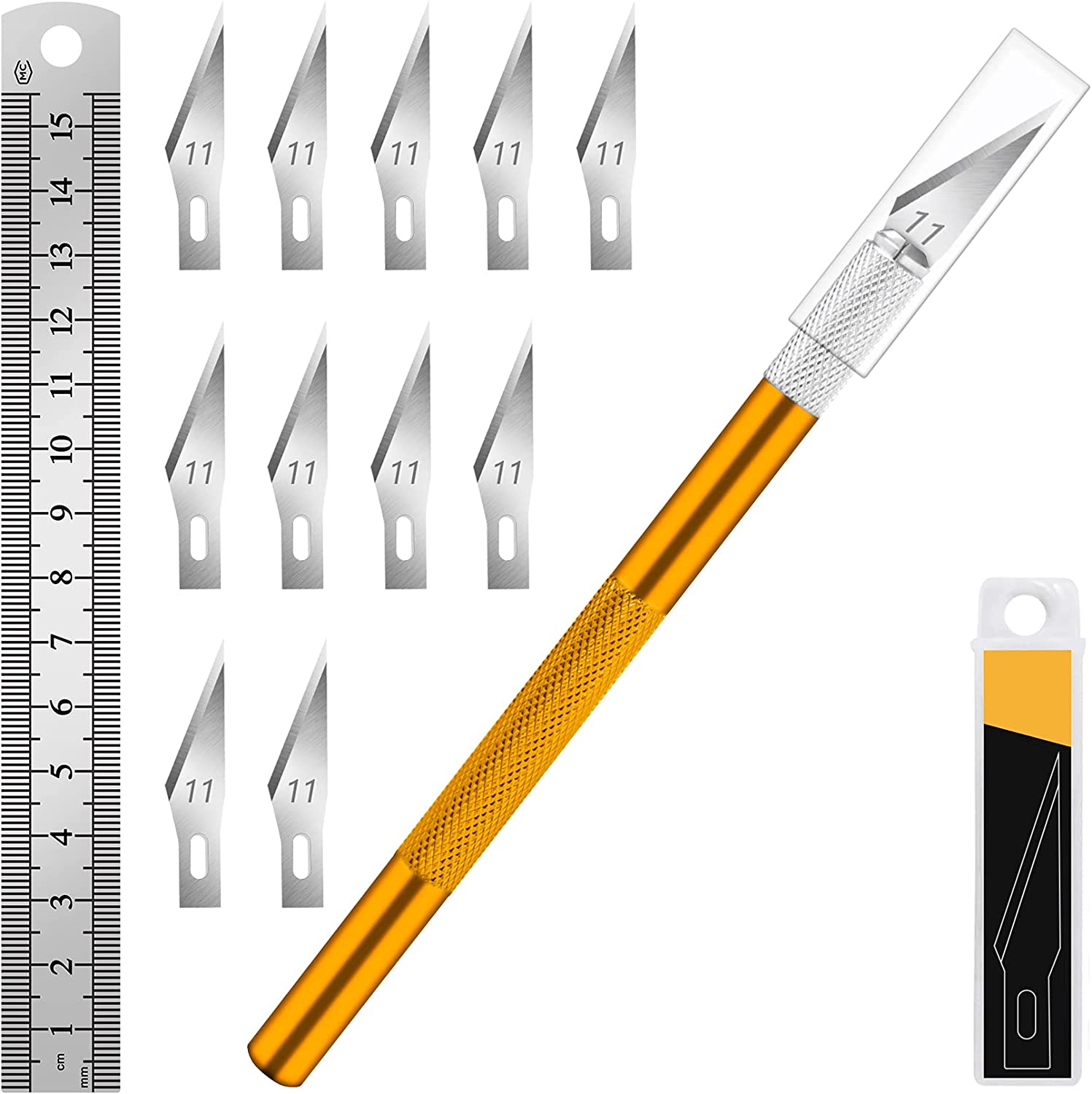 • Valuable Package Content:1pcs hobby knife,10pcs hobby knife blades,1pc steel ruler(6inch/15cm long)