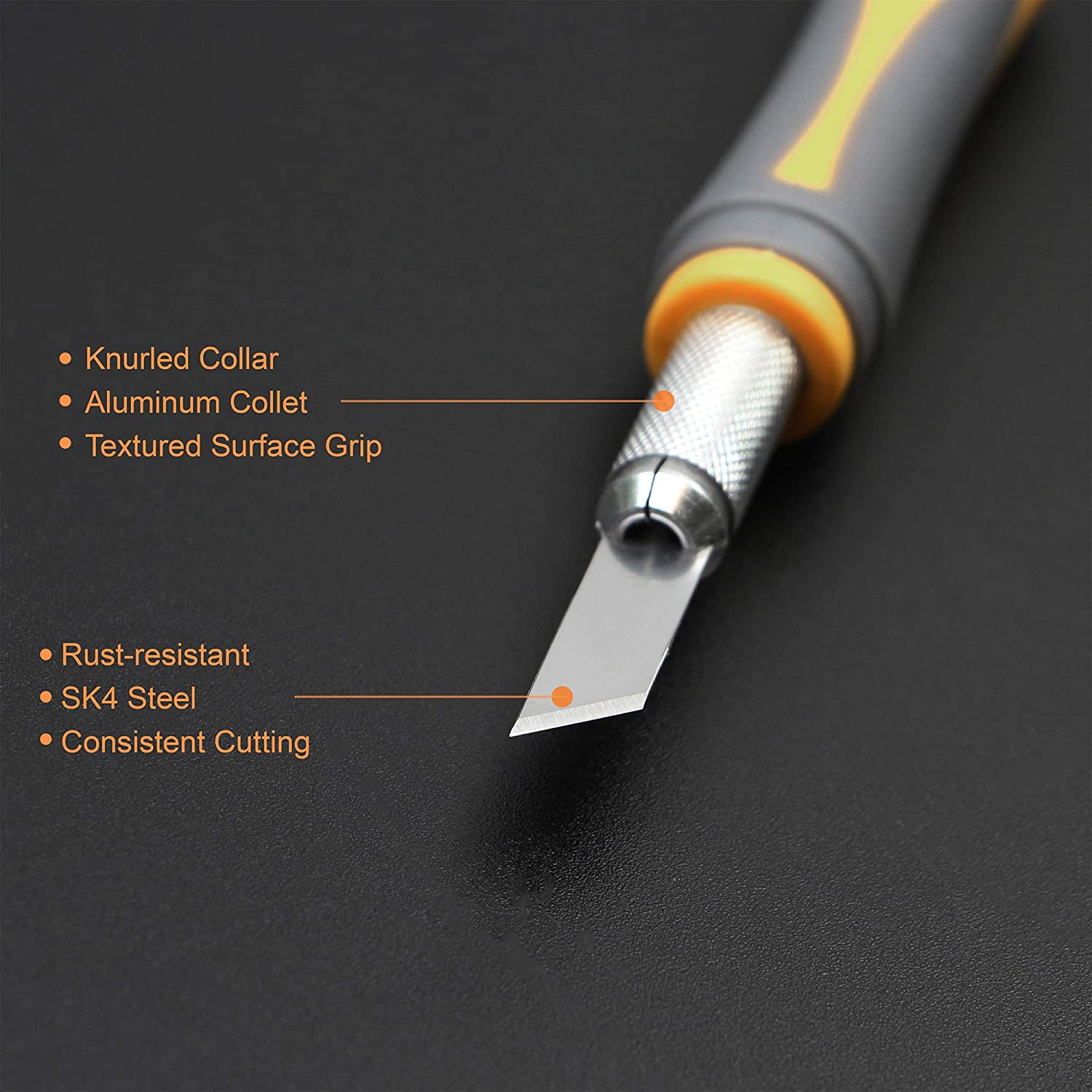 • BUILT TO LAST — The SK4 hardened carbon steel refill blades included are durable and rust-resistant, and can stand up to extended periods of tough projects to provide you with reliable and consistent daily cutting use. Professional exacto knife set for artist, architects, graphic designer, hobbyist and modeler