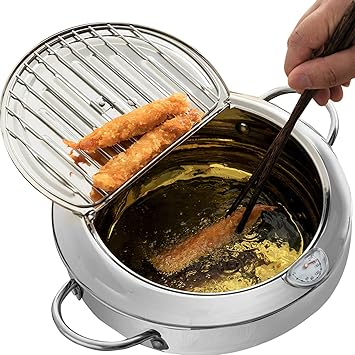 Yopay 304 Stainless Steel Deep Fryer Pot, Frying Chicken Pot, Tempura deep Fryer with a Thermometer and a lid, Japanese Style Tempura Fryer Pan, 2.2L