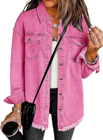 luvamia Denim Jacket for Women Oversized Button Down Casual Jean Shacket Jackets Long Sleeve Frayed Hem Western Trendy