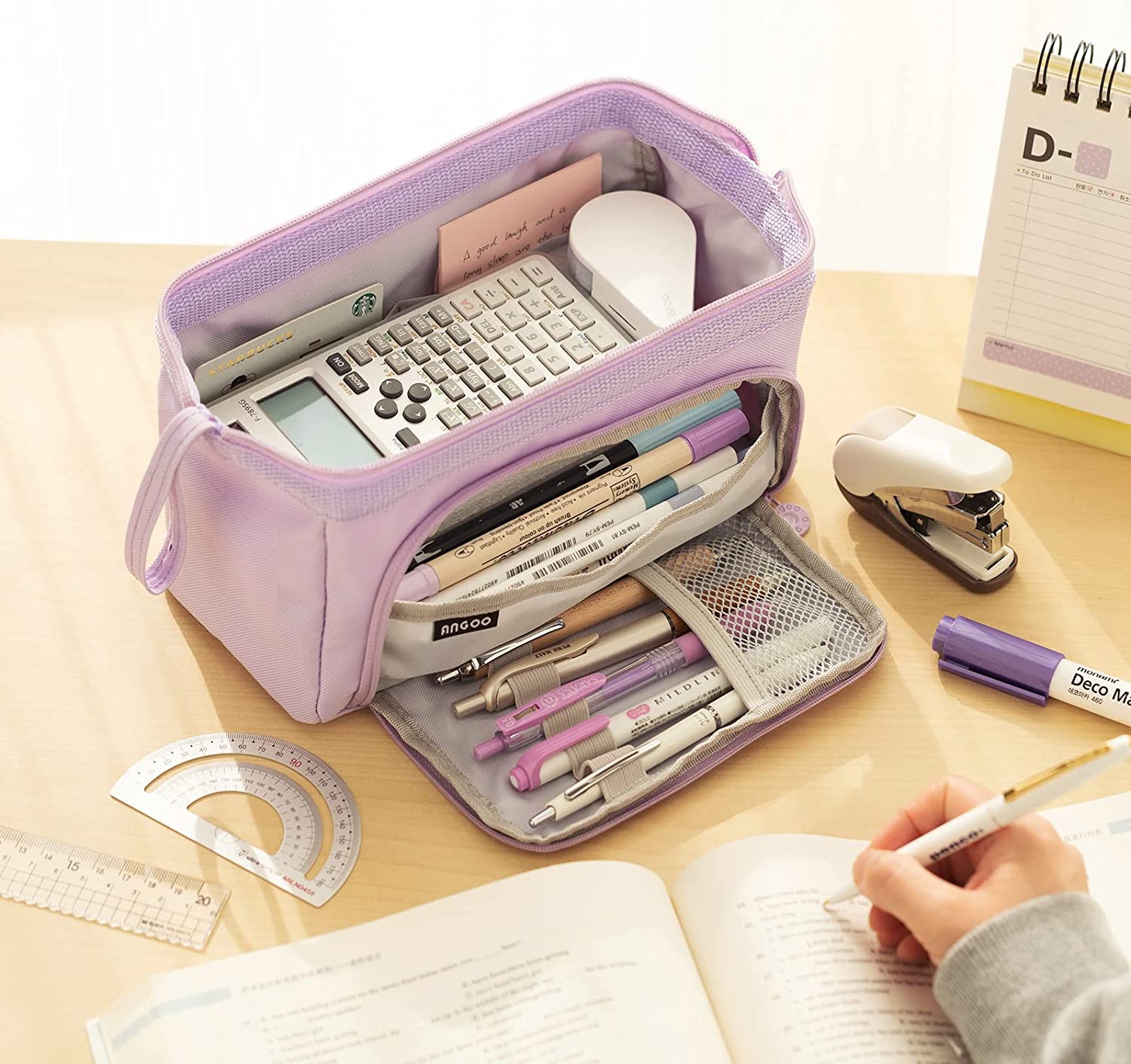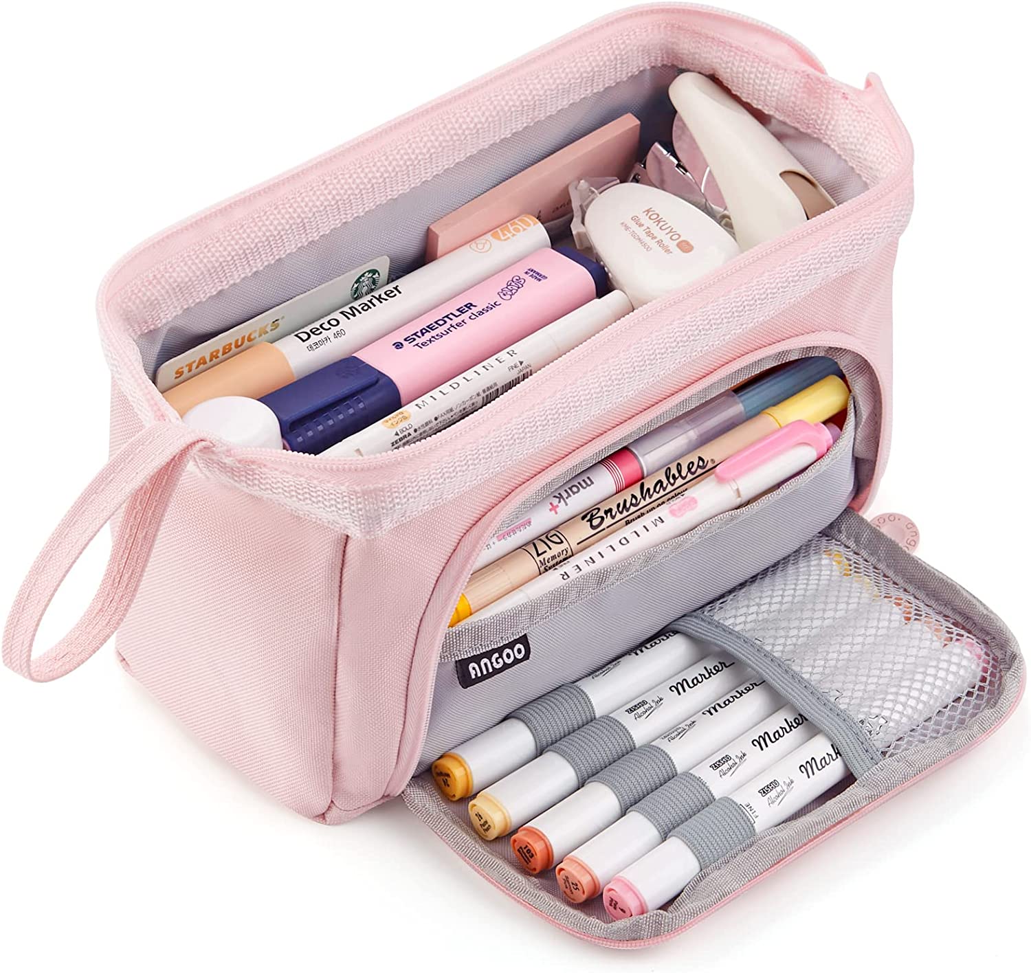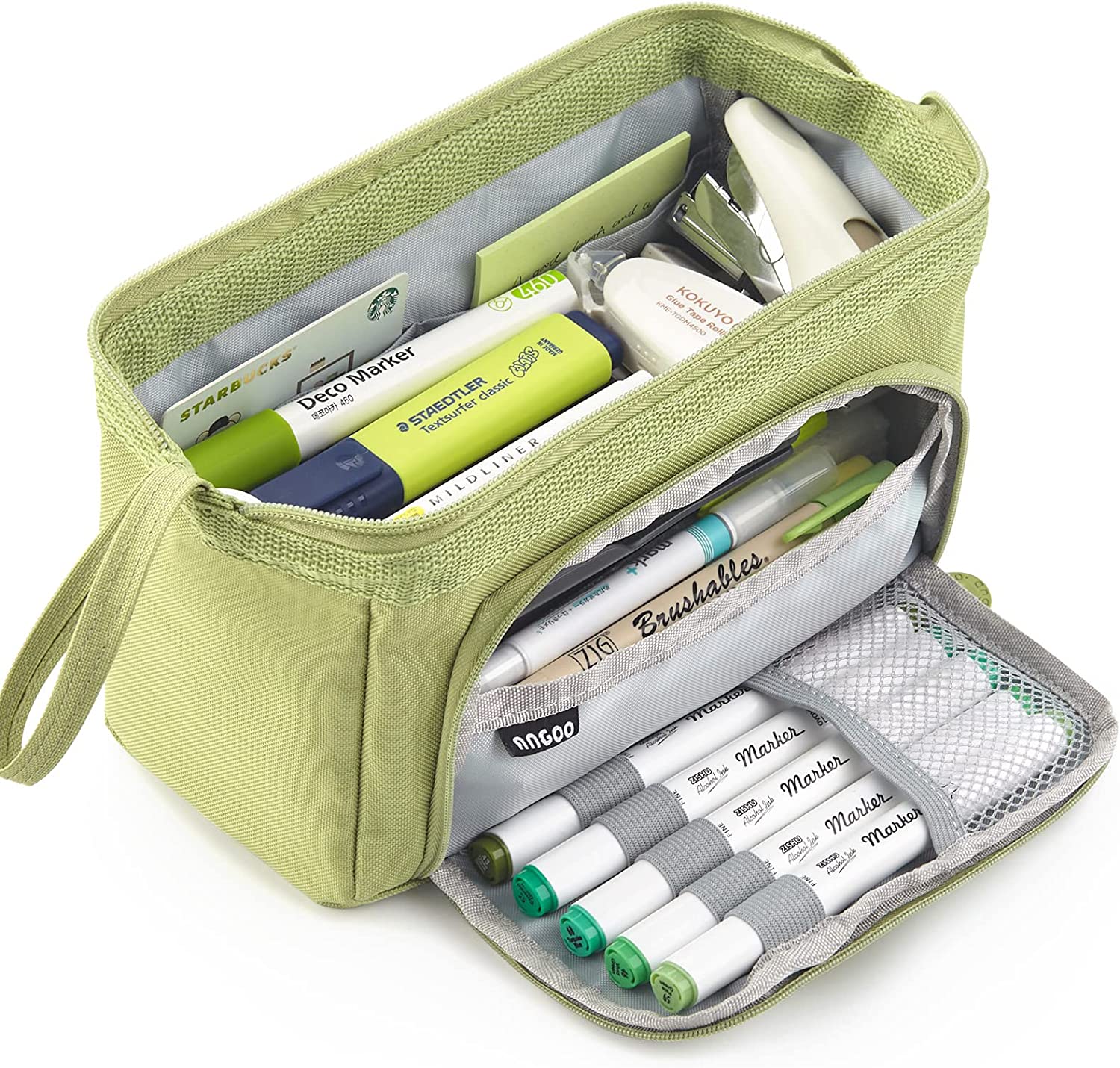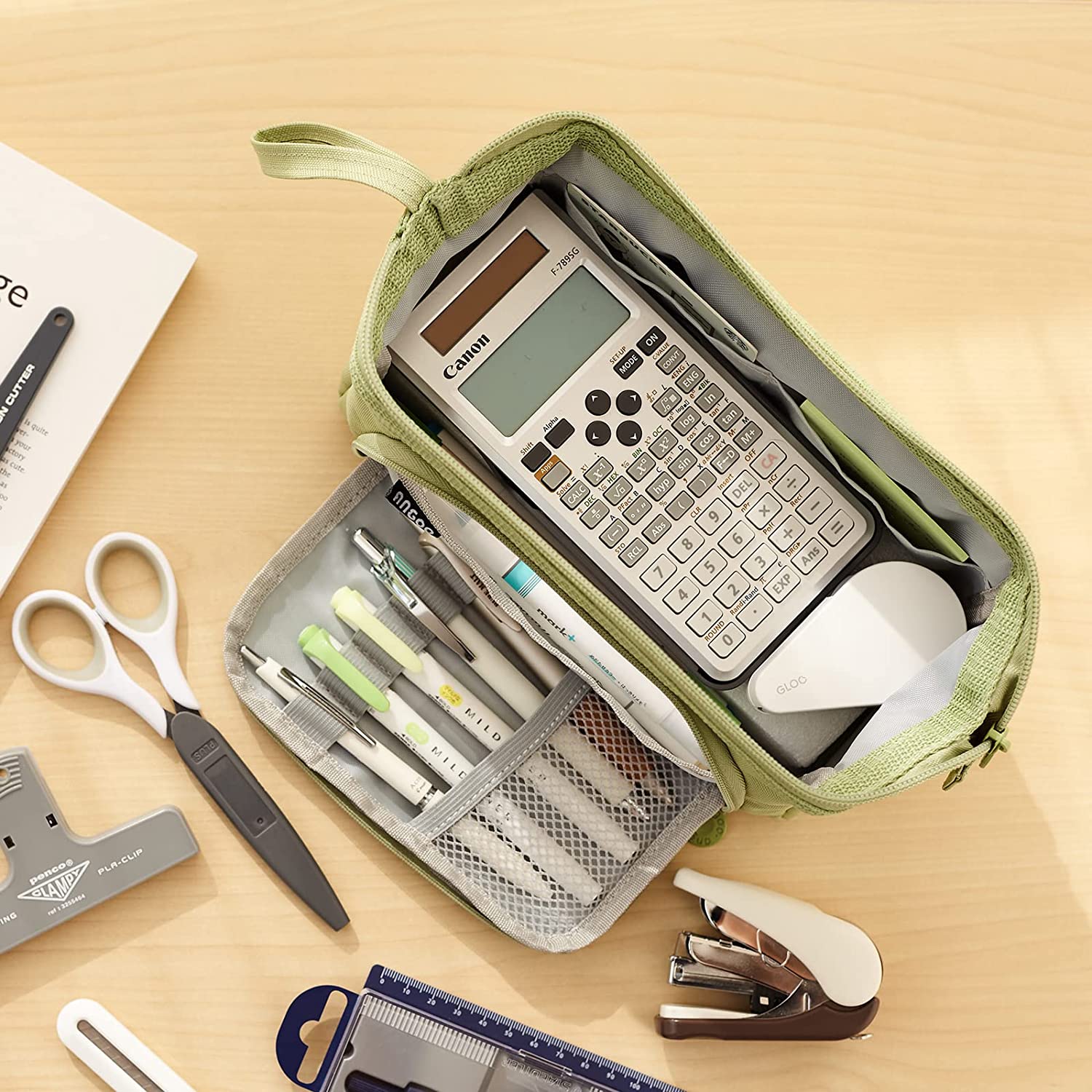 • 【Unique Design】: Open pencil case from the top or The opening front flap (and the 5 slots in the flap can fix commonly used pens); An extra handle on the side makes the pencil bag easy to carry.