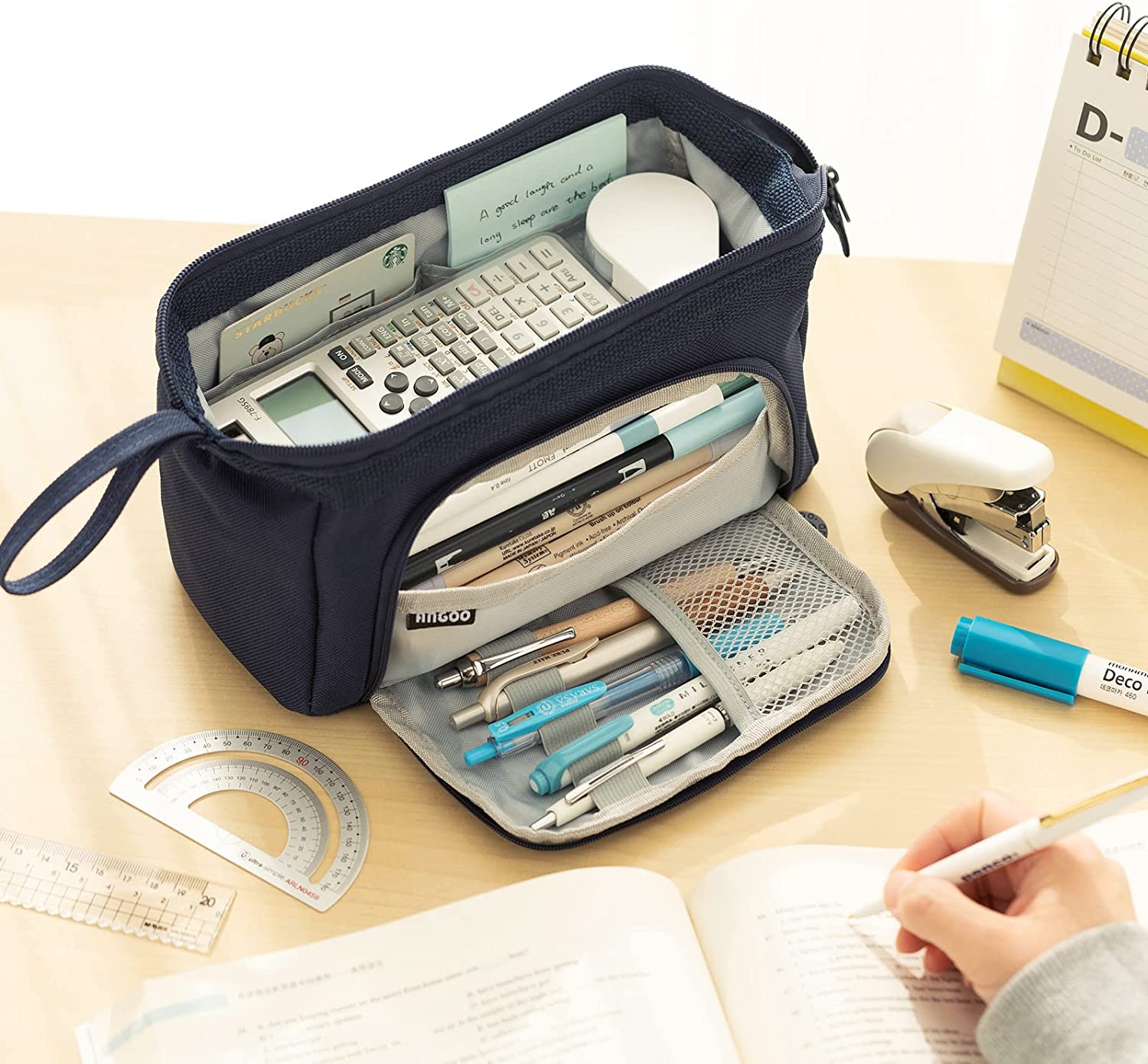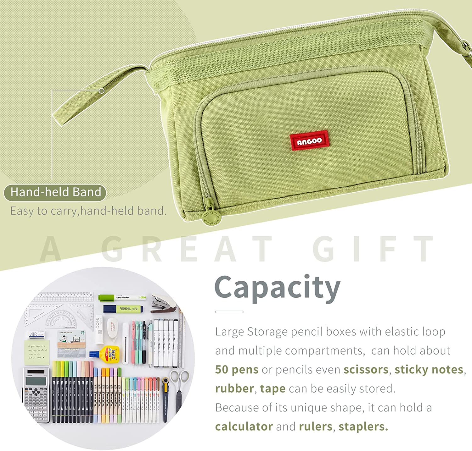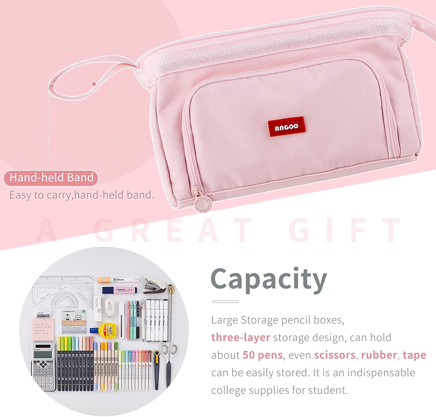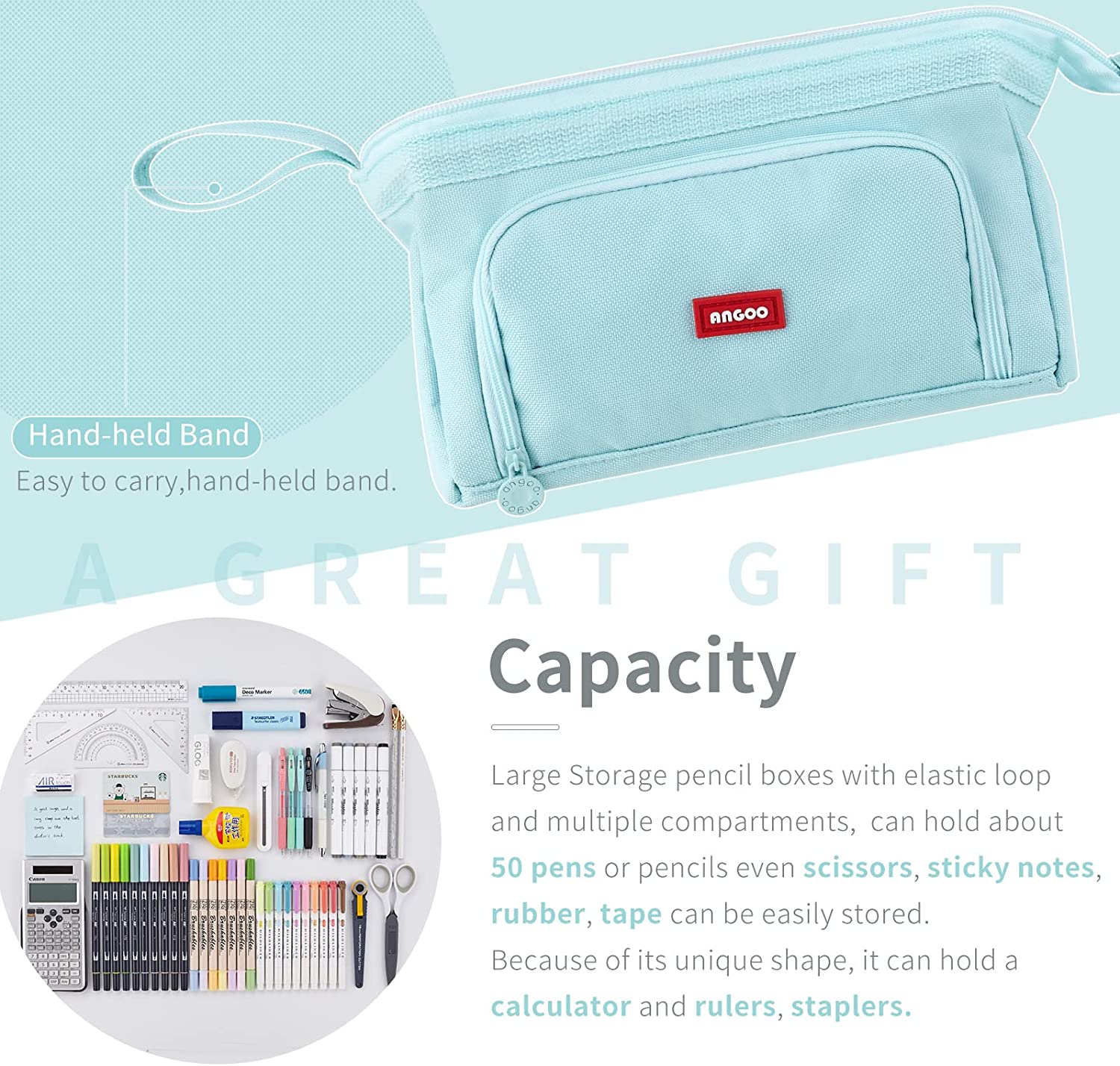 • 【Upgraded Large Capacity, Ideal For Various Occasions】: Large Storage pencil boxes sophisticated inner structure with elastic loop and multiple compartments, have the ability to store and organize up to 100 pens or pencils even scissors, sticky notes, rubber, tape can be easily stored. Because of its unique shape, it can hold a calculator and rulers, staplers.