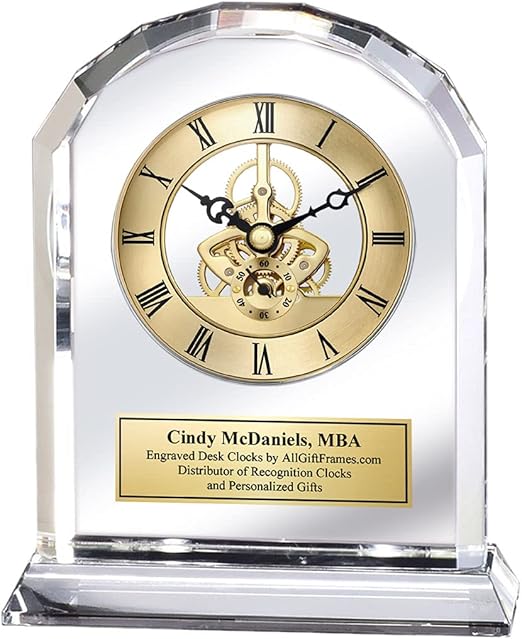 AllGiftFrames Diamond Cut Marquee Arch Clear Crystal Engraved Gold Gear Luxury Desk Clock Executive Employee Service Retirement Gift Anniversary Glass Table Top