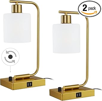 Hamilyeah Gold Table Lamps for Bedroom Set of 2, Stepless Dimmable Desk Lamps for Home Office, Industrial Bedside Lamp with USB Charging Port, Modern Nightstand Lamp with Frosted Glass, Bulb Included