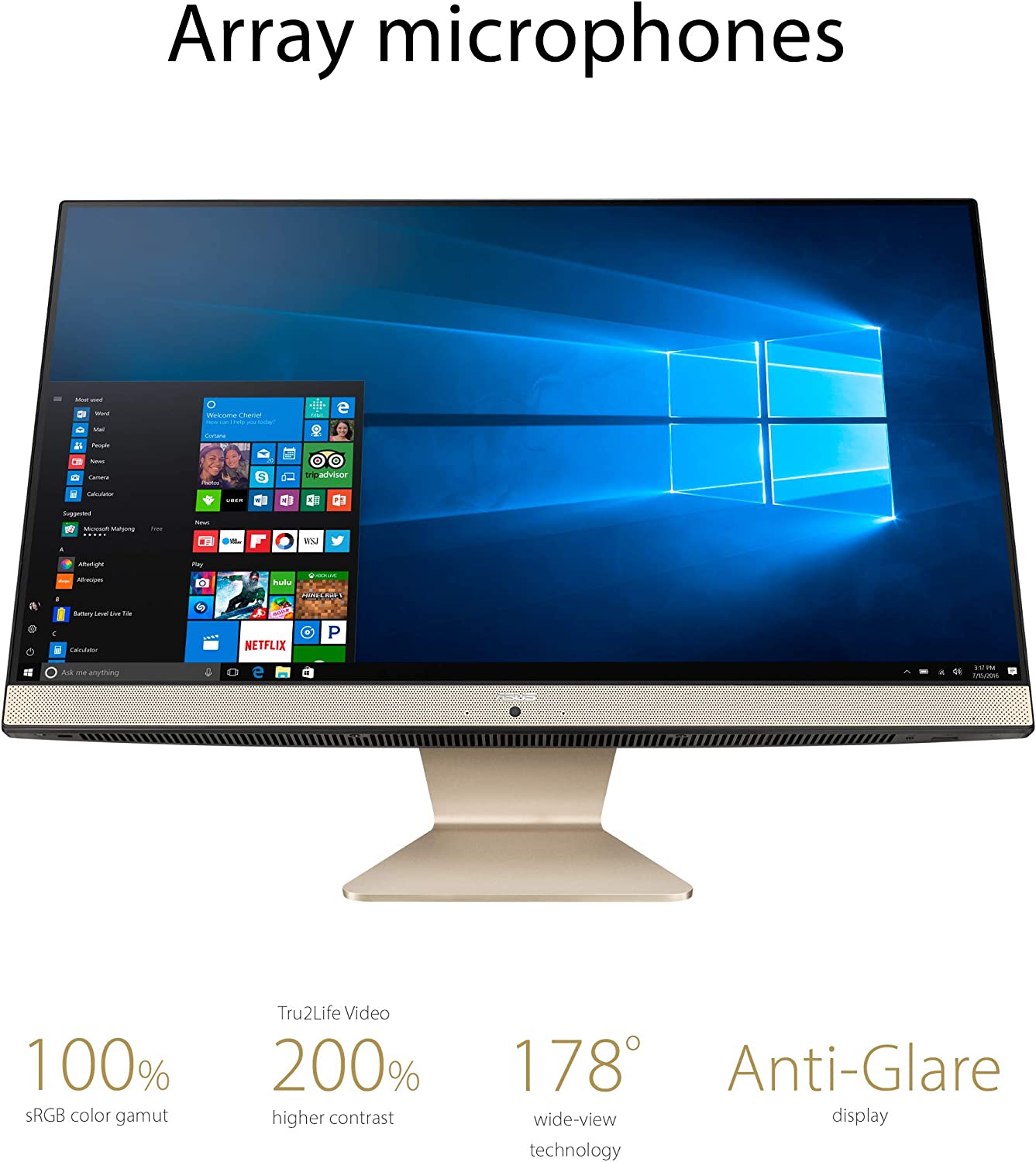 ASUS V241 All-in-One PC features a 23.8-inch 16:9 anti-glare display that ensures crystal-clear images. This all-in-one is built for effortless performance and smooth multitasking. V241 is designed for convenient connectivity and is equipped with expansive connectivity. Zen plastic golden wired keyboard and mouse included. Free Windows 11 upgrade eligible devices, visit ASUS Windows 11 website for more information.