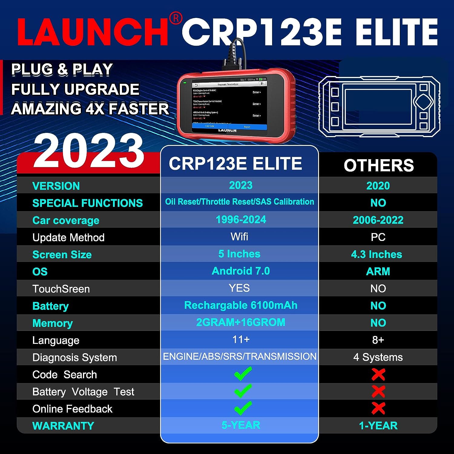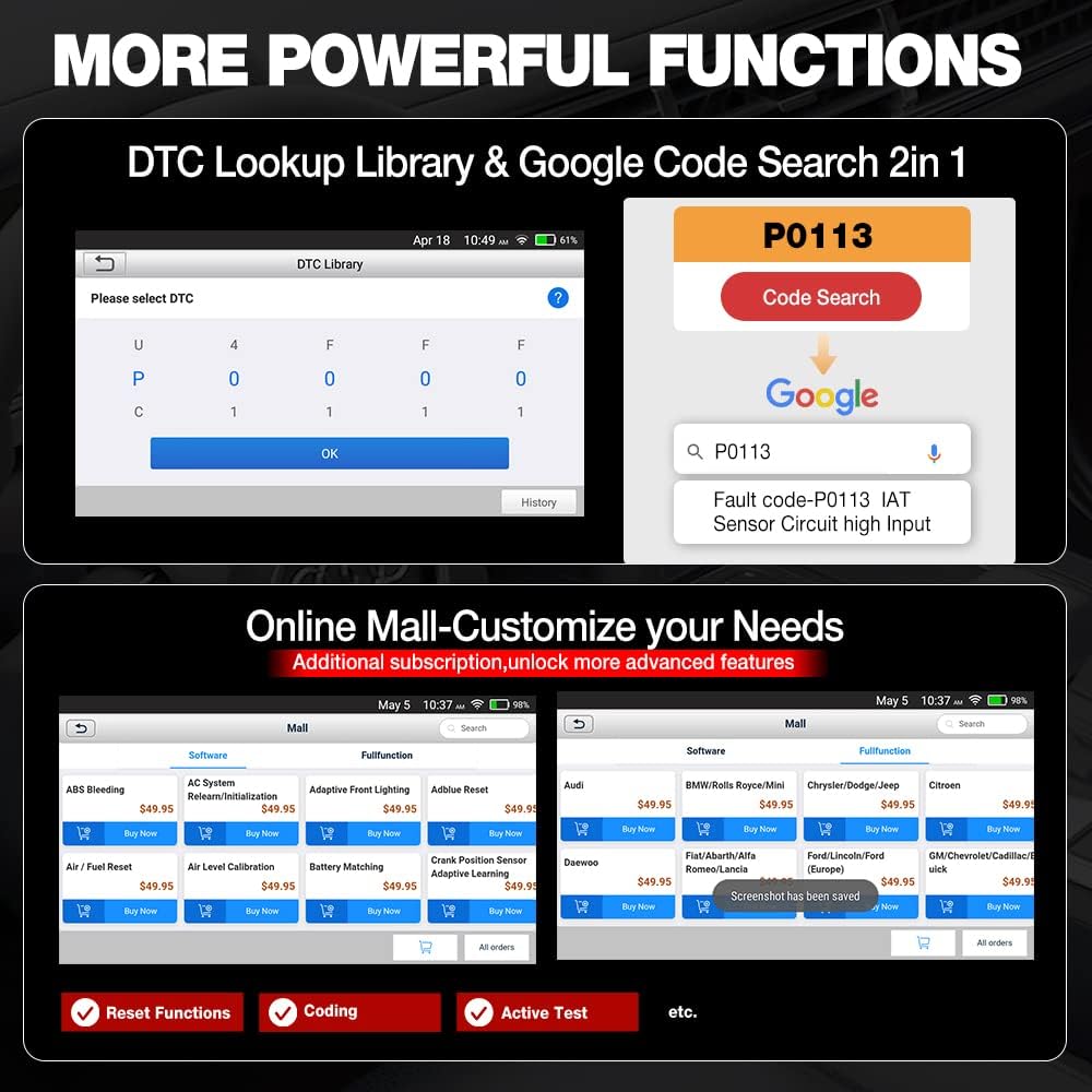 • 🎉【2023 Upgrade Version】LAUNCH CRP123E obd2 scanner check ABS/SRS/AT/ENG systems &10 OBD2 modes, read/clear fault codes,💡Online Google Search, 4 IN 1 Graphing. Store and playback of dynamic data stream help to quick analysis and diagnosis. Generate vehicle health reports with one click and share them with your email via Wifi which helps avoid blind maintenance. CRP123E costs less, in the long run, saving you up to $2000 each year.Any problem,please reach us via ✅ cardiag-aftersales@hotmail.com