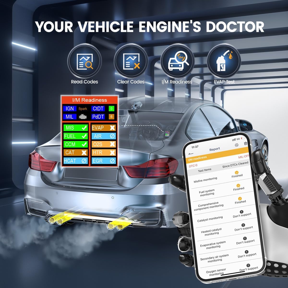 • FULL OBDII MODES: BD310 Bluetooth OBD2 Scanner is a professional diagnostic tool for reading and clearing fault codes and closing CEL, it not only accurately determines codes and possible causes, but also performs DTC searches, O2 sensor tests, I/ M Ready, Onboard Monitor Test, Read Data Stream, Display Freeze Frame Data, EVAP System Test, Retrieve Vehicle Information (VIN) and Generate Diagnostic Report, saving car owners a lot of time and money.