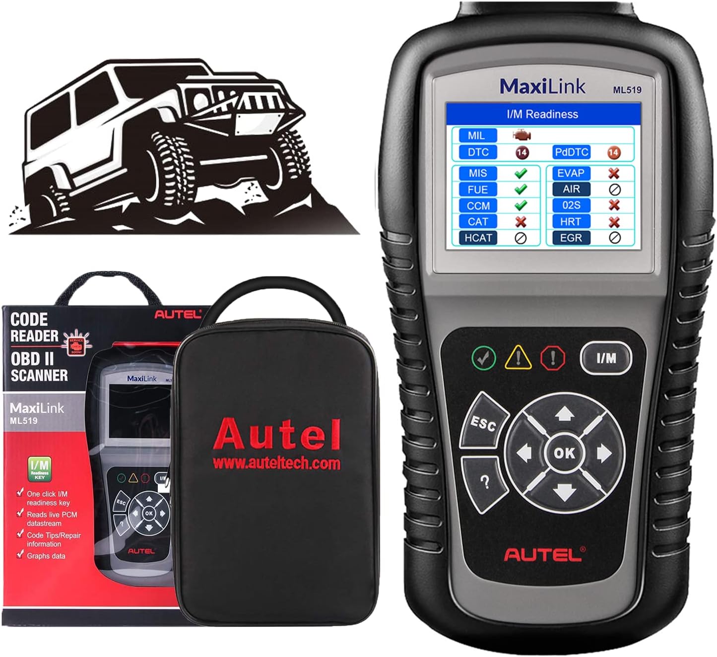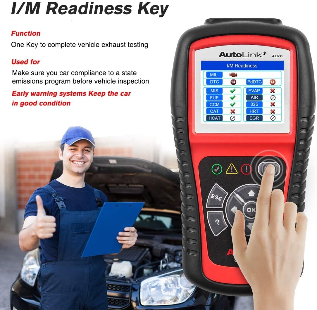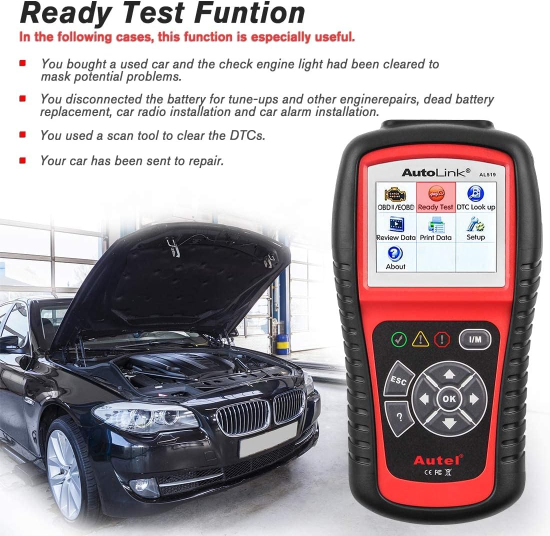 • 🔥【Enhanced New Features】AL519 OBDII diagnostic tool features patented One-Click Smog Check, easy-to-read AVOmeter to test voltage, continuity and current at the fingertip, capable of diagnosing 12V charging systems, starting systems and condition of discharged battery, memory/battery backup for data review and data printing via PC for further analysis.