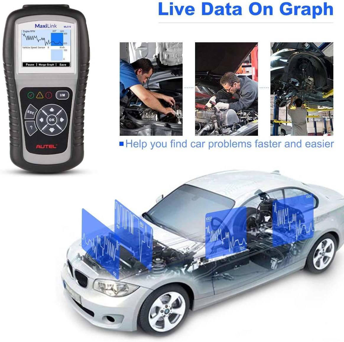 • 🔥【Live Data Graphing & Freeze Frame Data & Retrieve Vehicle Info】With Live Data functions, Autel AL519 OBD2 code reader allows you to view the live PID (Parameter Identification Data) of the vehicle's computer module(s) in text, graph to check the status of various sensors. And Freeze Frame Data enables you to view the vehicle's operating parameters at the moment a DTC is detected, which will aid the technician by allowing the parameters to be duplicated for diagnostic and repair purposes.