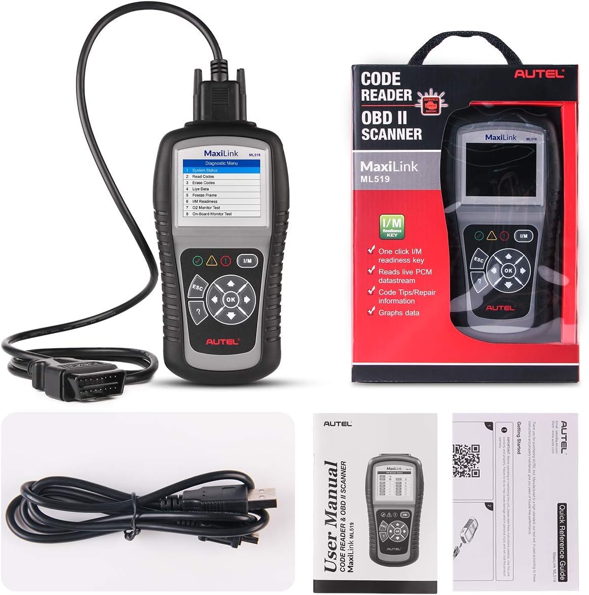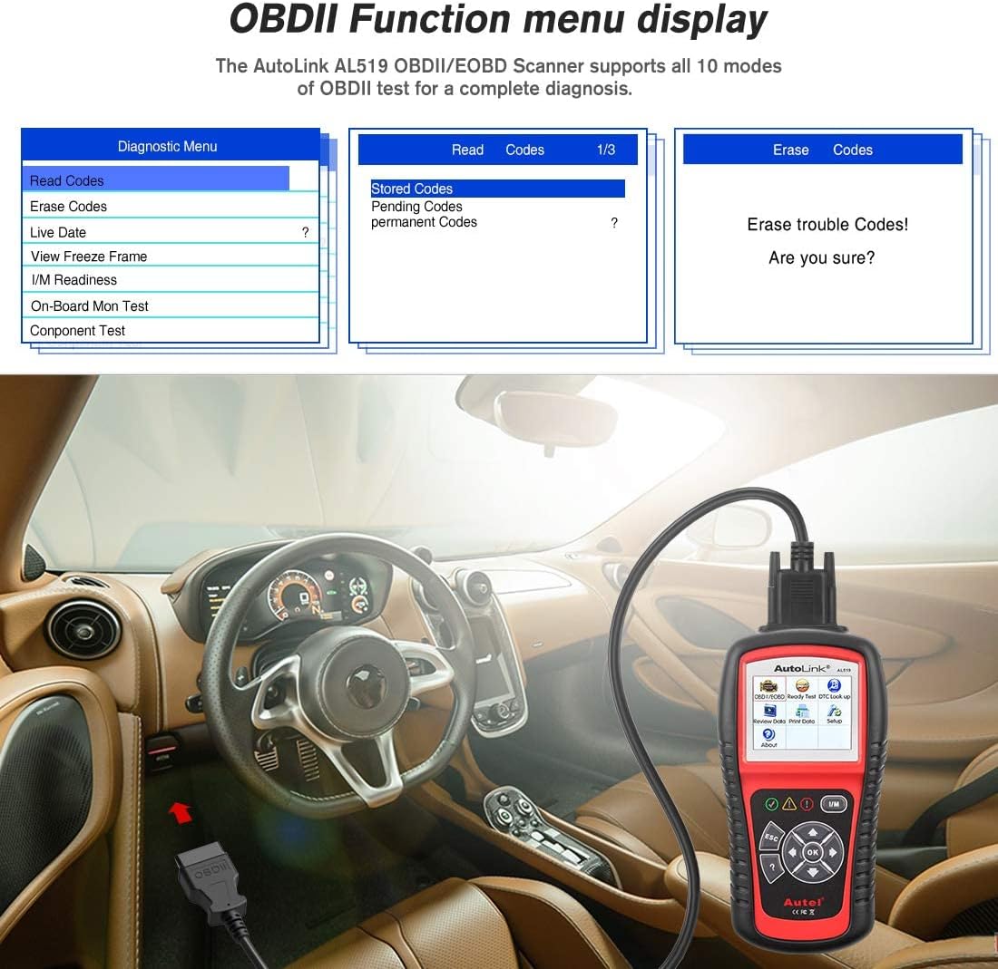 • 🔥【All 10 Modes of OBDII Tests】Autel AL519 OBDII scanner can perform all 10 modes of OBDII tests for complete OBD2 diagnosis, including read codes, erase codes, view live data, patented one-click smog check, freeze frame data, O2 monitor test, on-board monitor test, component test, view vehicle information, module present. AL519 scanner is the most complete & cost-effective OBD2 code reader.
