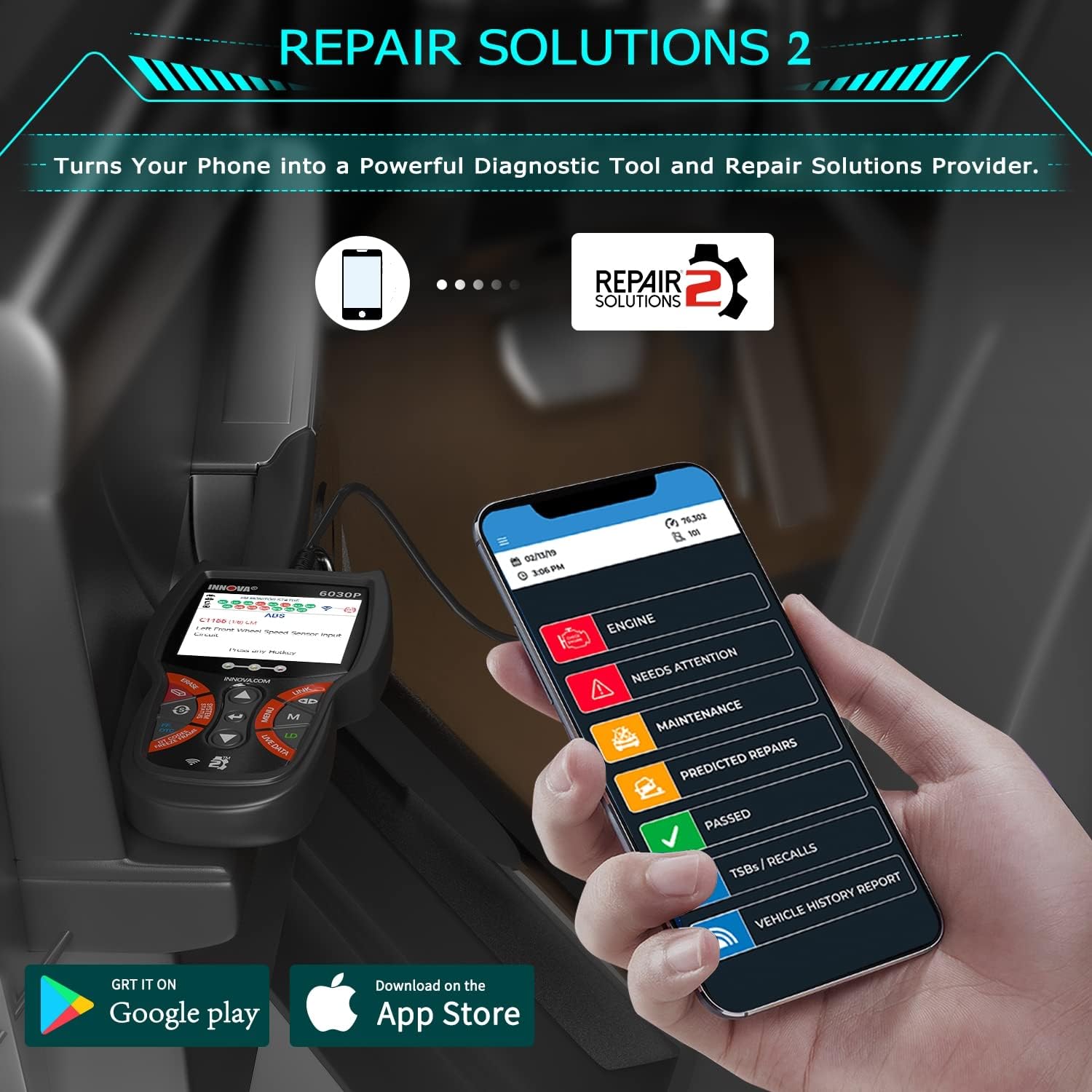 • 【CODE SEVERITY LEVELS】--- INNOVA 6030P ABS obd2 scanner code severity levels function helps you easily find and fix the problem via app “Repair Solutions 2” on App Store or Google Play, which can assist both Do-ItYourself and Professional technicians in quickly and accurately diagnosing and repairing vehicles. Connect your code reader to a vehicle and establish a Bluetooth or WiFi connection with your smart device. Be sure your smart device is connected to an available WiFi network.