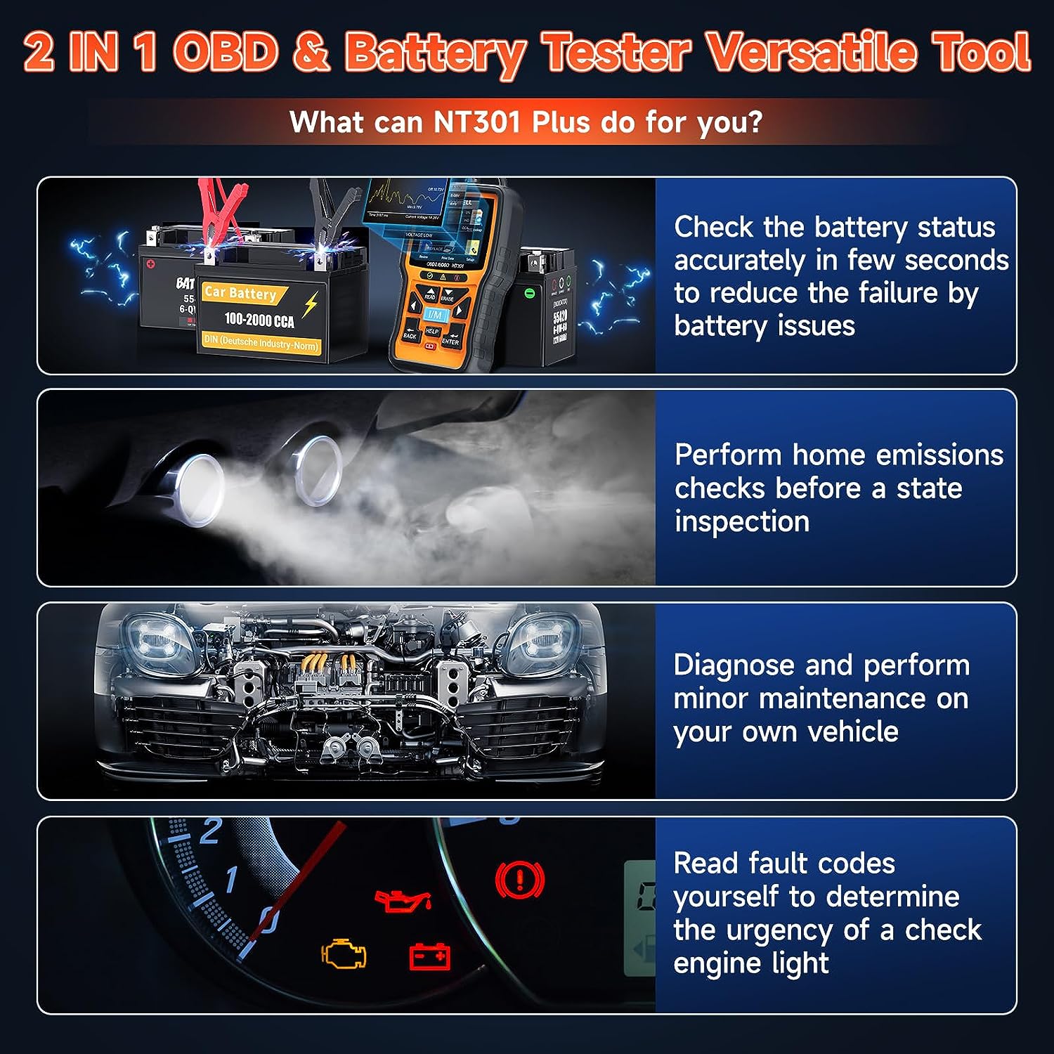 • 【Additional Battery Test - Helping you to Identify Failing Battery】NT301 plus obd reader scanner can quickly, easily and accurately identify car battery, starting, charging system problems (display in just 3 seconds), to provide you critical informations about battery health status. It is helpful for you avoid the inconvenience of a roadside breakdown from a dead battery, and also keep a close eye on battery status without spending too much on mechanic fee.