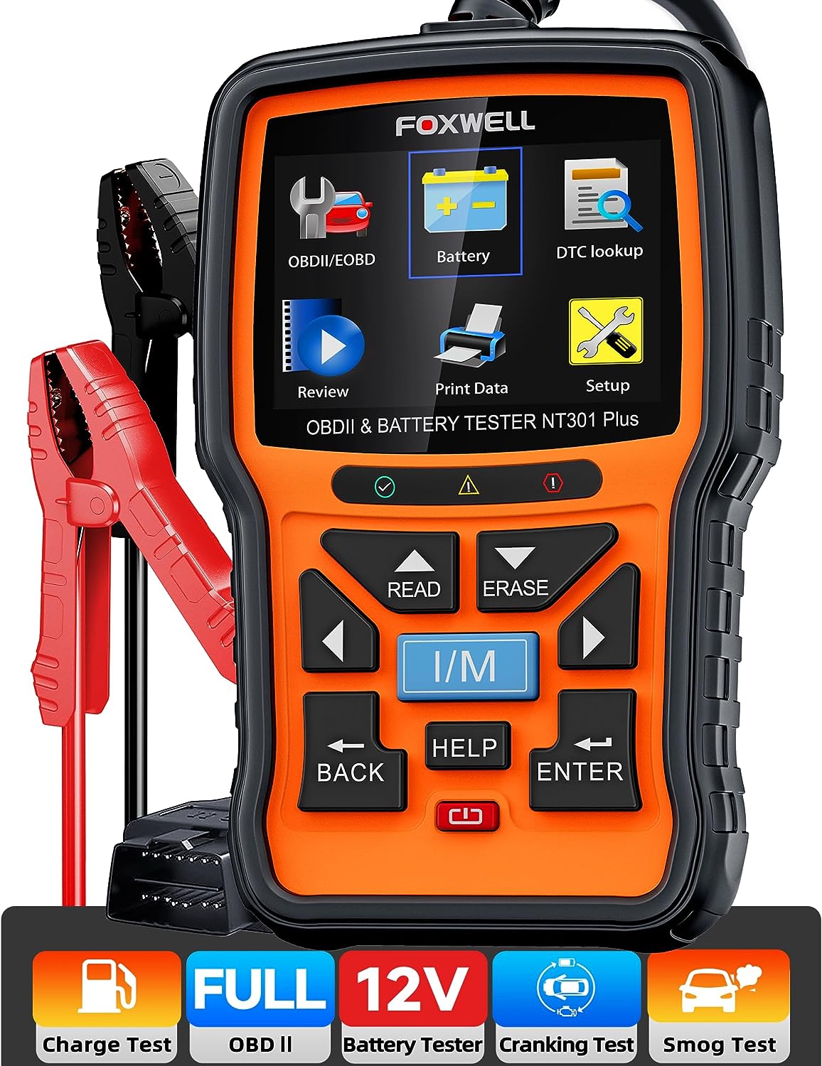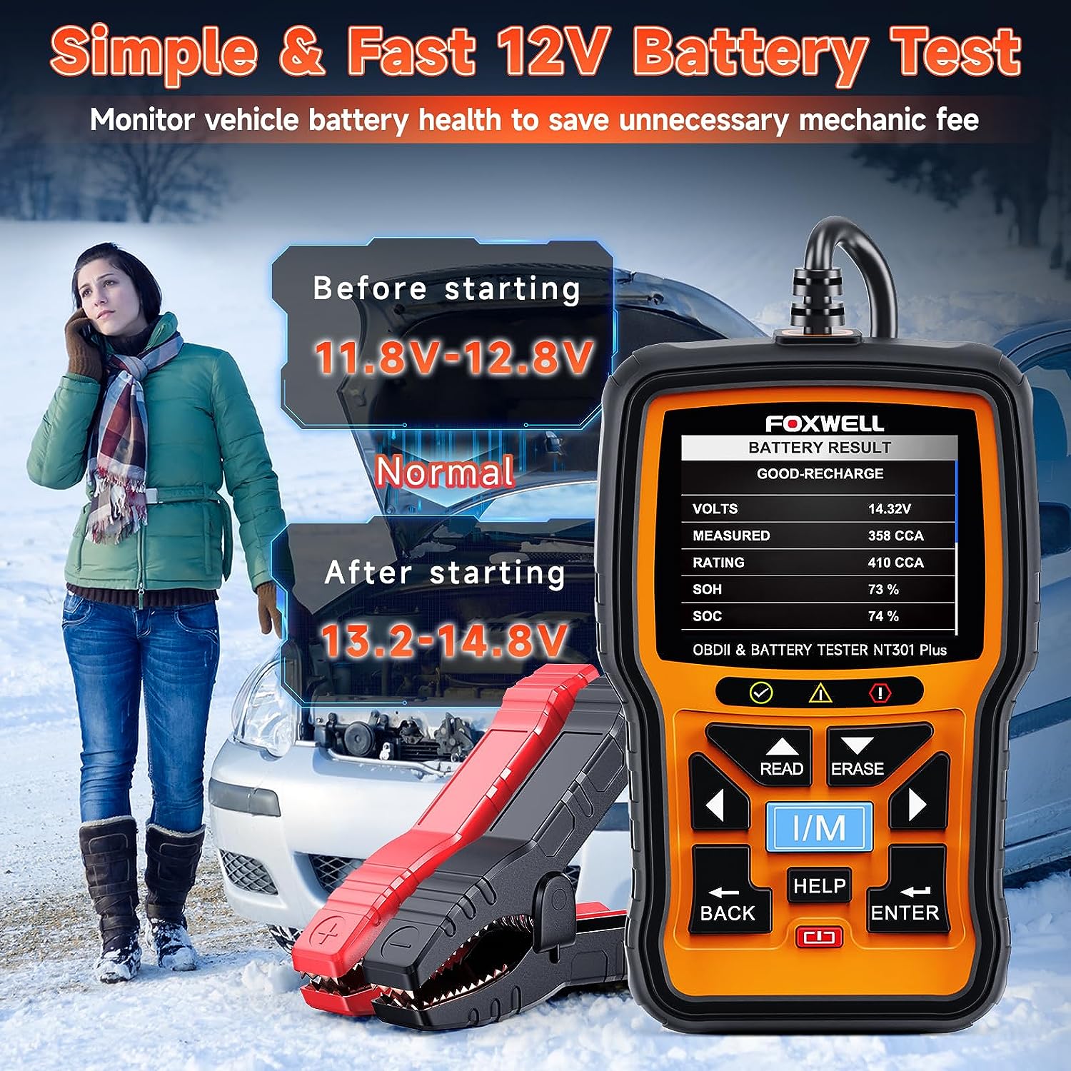 Upgrade NT301 Plus FOXWELL OBD2 Scanner Battery Tester 12V, 4 IN1 OBD Scanner Diagnostic Tool Car 100-2000 CCA Battery Charging Cranking System Test Check Engine Code Reader Scan Tool EVAP Live Data