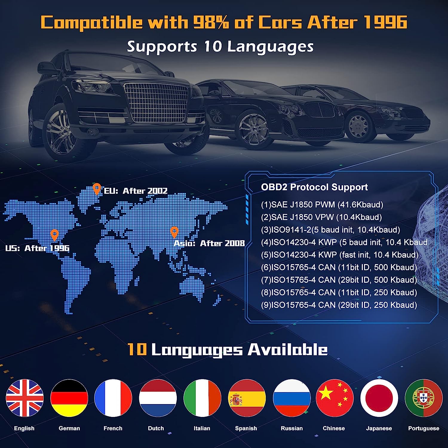 • ✔Compatible with 98% Vehicles: ZM201 OBD2 scanner for car is compatible with most cars after 1996(USA)/2002(EU)/2008(Asia). If your car has an OBD2 port (16Pin), and the production time meets the above timeline, then your vehicle is compatible. But it is not compatible with new energy vehicles, hybrid vehicles, and models that do not comply with the OBD2 protocol.
