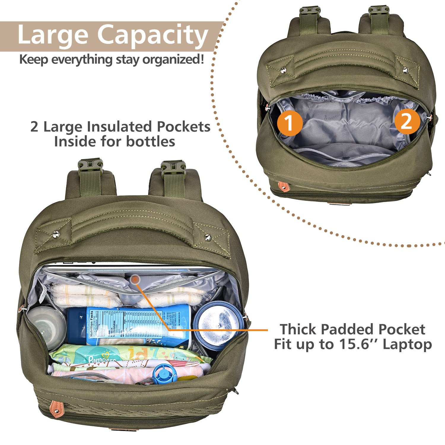 BabbleRoo Diaper Bag Backpack, Unisex Bags with Changing Pad, Pacifier Case & Stroller Straps, Multifunction Waterproof Travel Back Pack for Boys Girls, Army Green