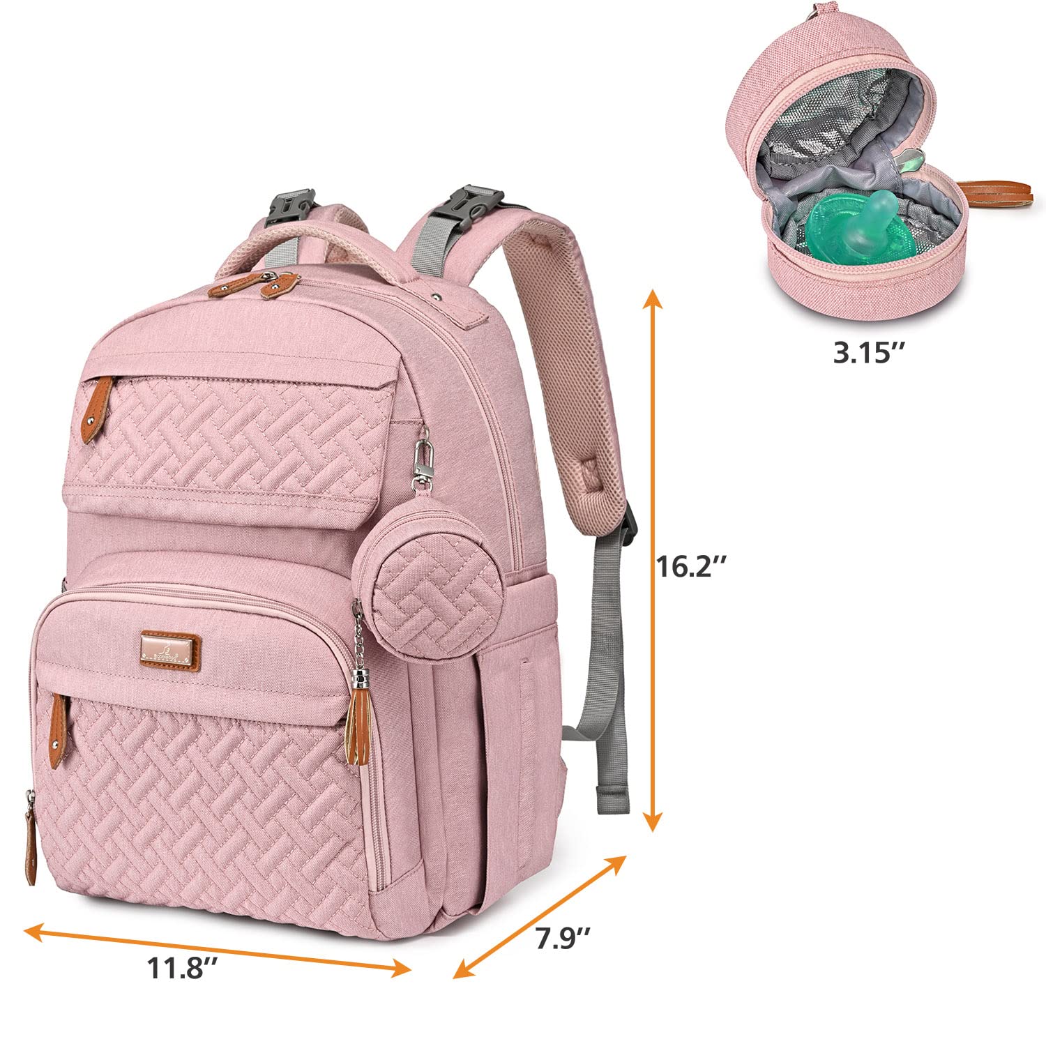 • Awesome Backpack Diaper Bag - Convertible diaper bag with plenty of features; includes a pacifier case, two built-in detachable stroller straps, a thick changing pad and a lot of convenient multi-sized pockets. Big enough for all your boys, girls or twins essentials with extra space to spare for your laptop, keys, wallets, and must haves.