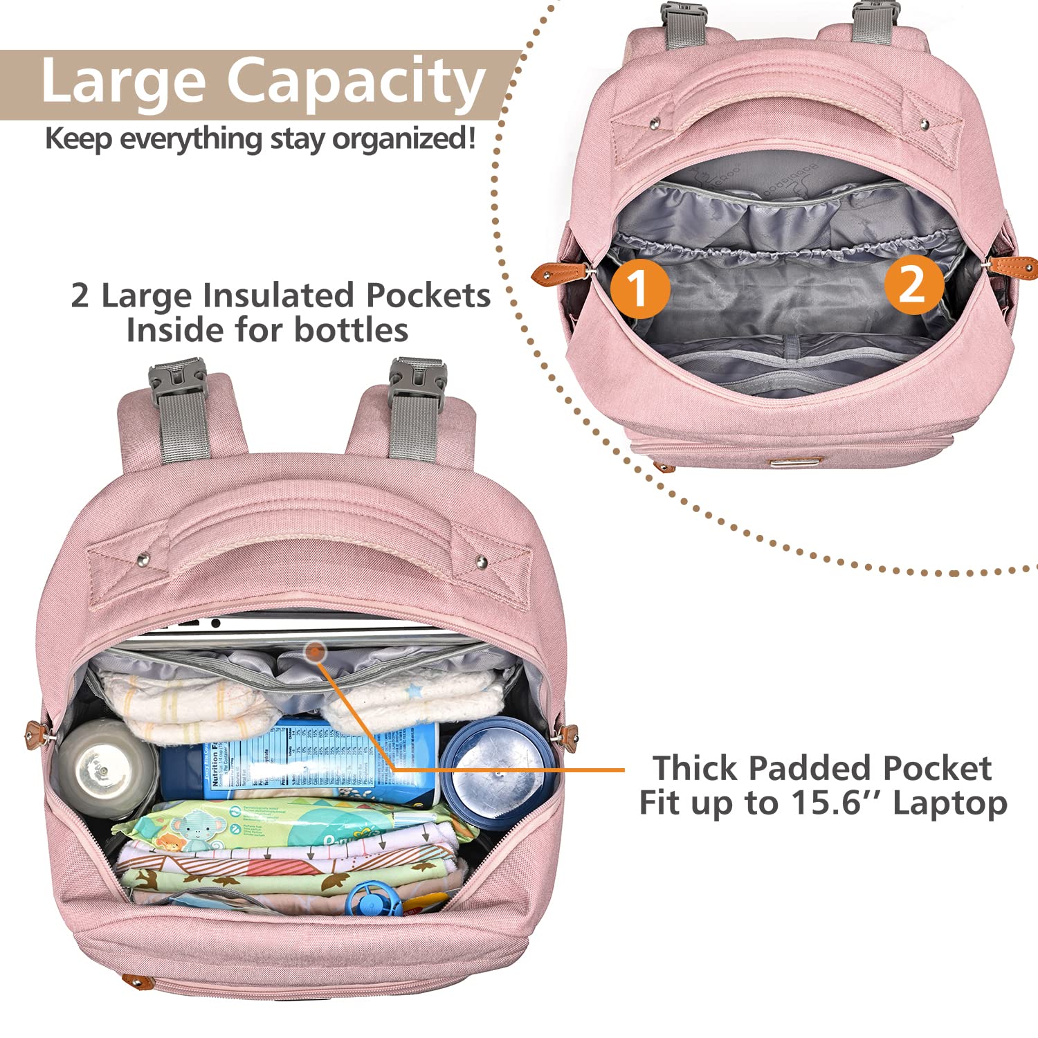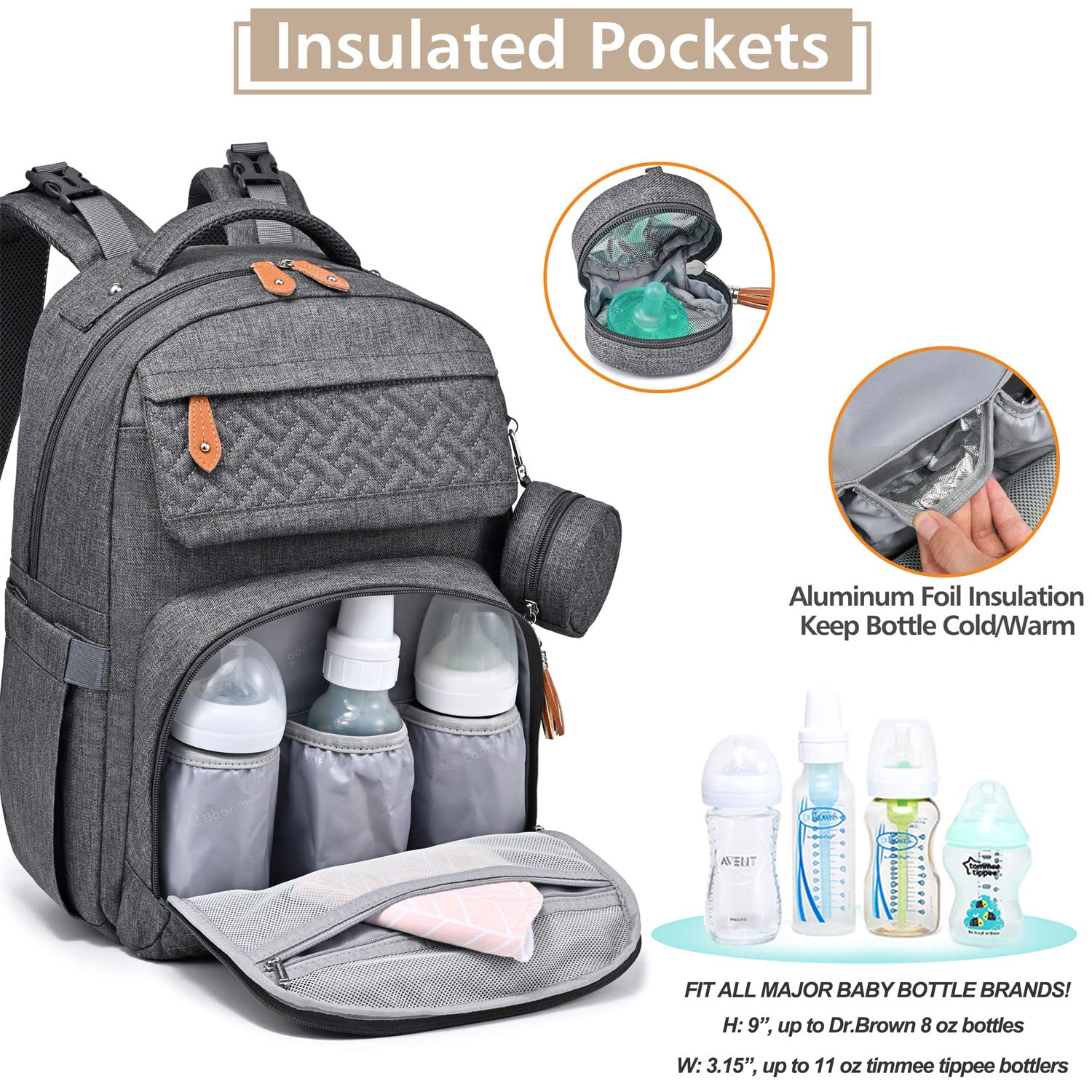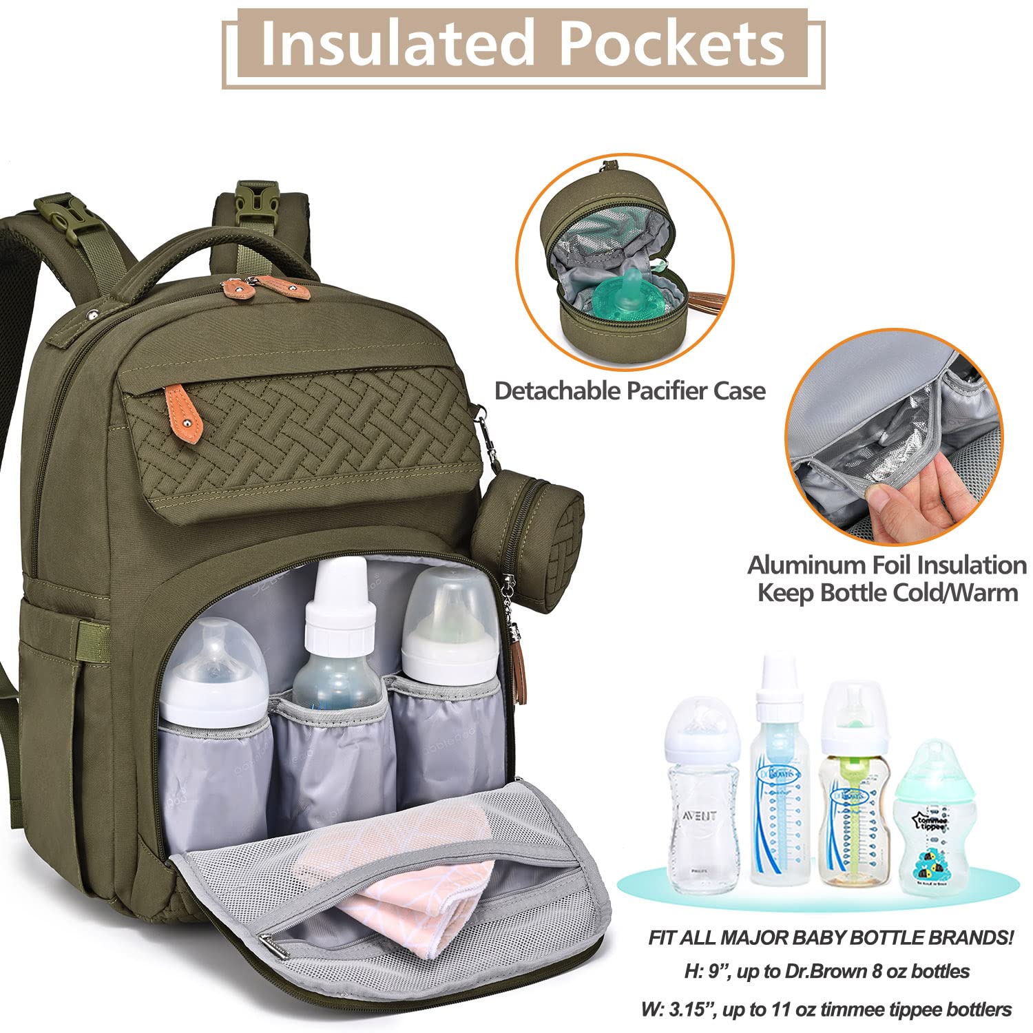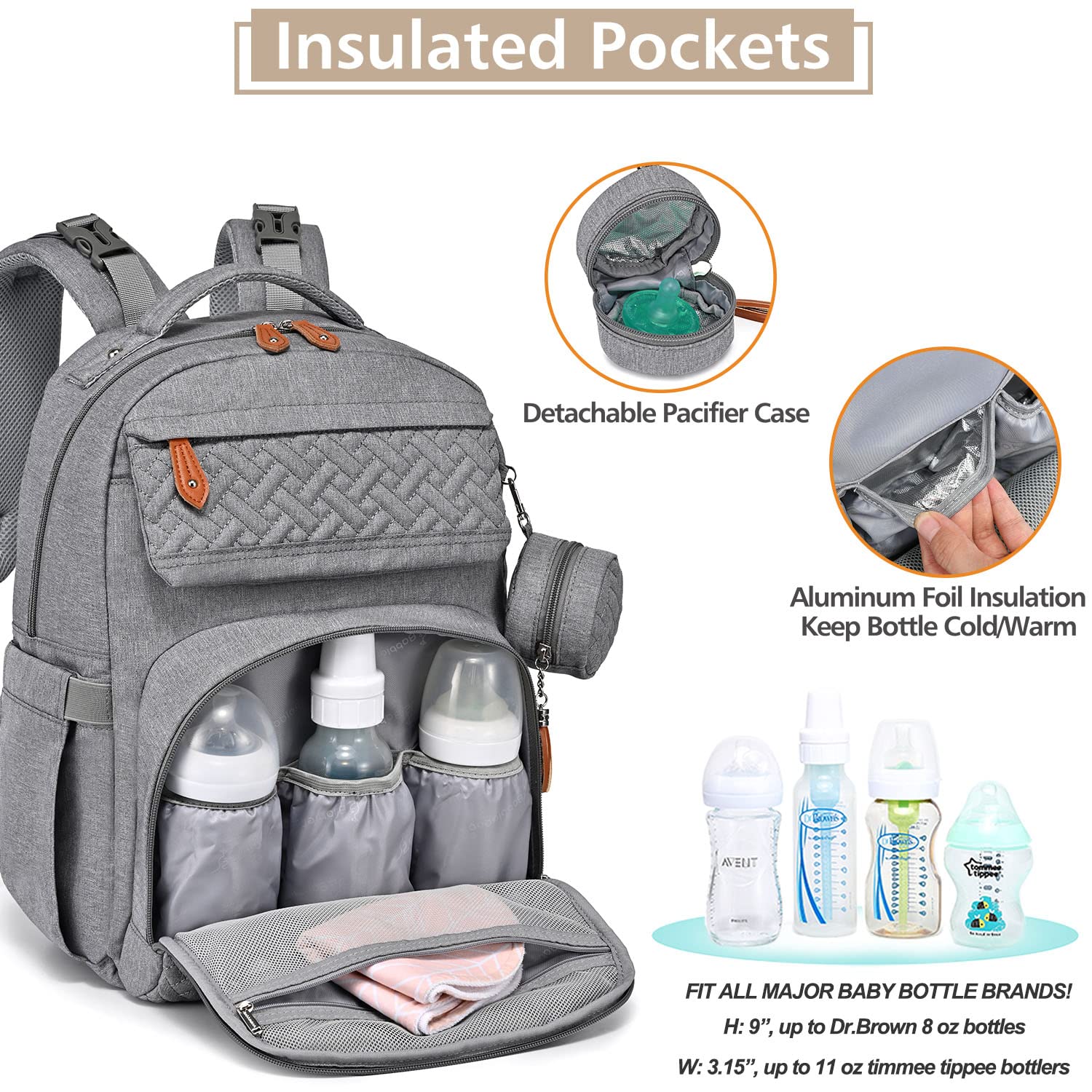 • Looks Great & Easy Organization - With a high-end fashion look, this normal size baby diaper backpack includes a main compartment and 16+ interior and exterior organizer pockets of varying sizes that will make it easy for Mommy & Daddy to stay organized. Five insulated pockets for keeping the bottle cold/warm. Makes a great addition to any baby registry!