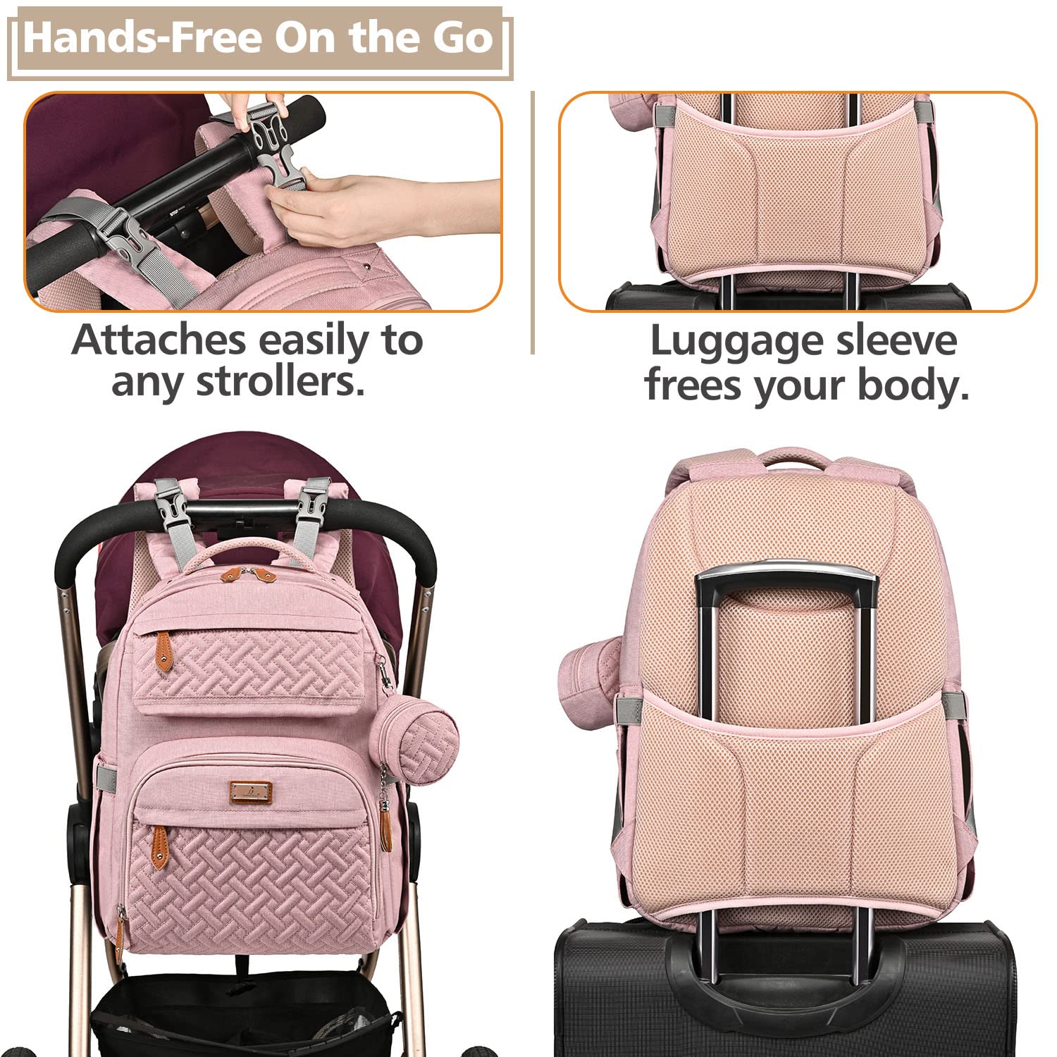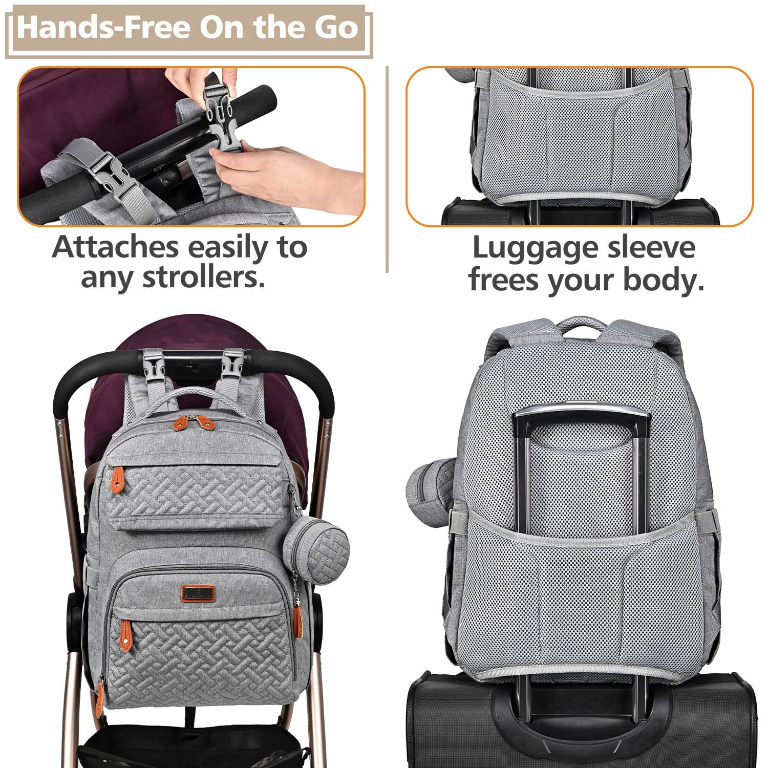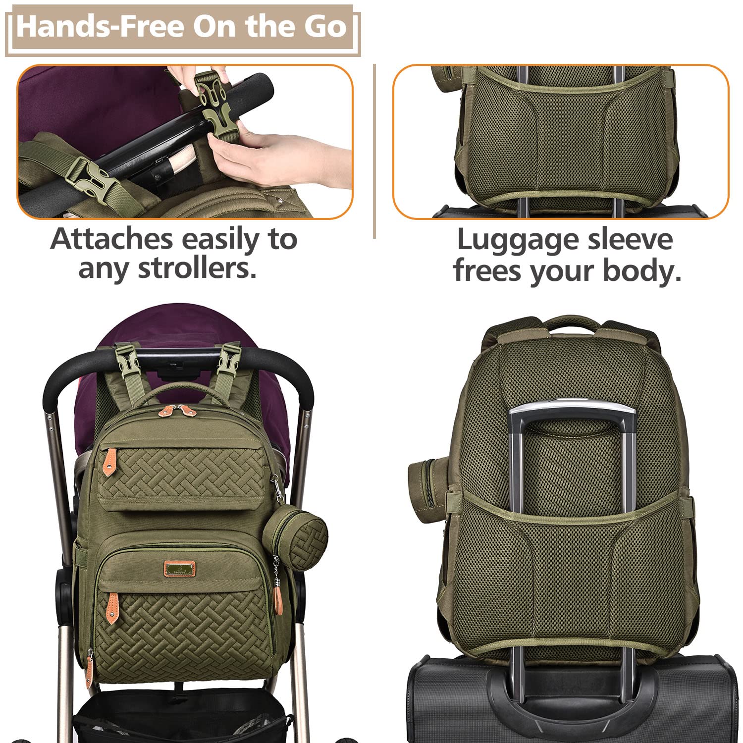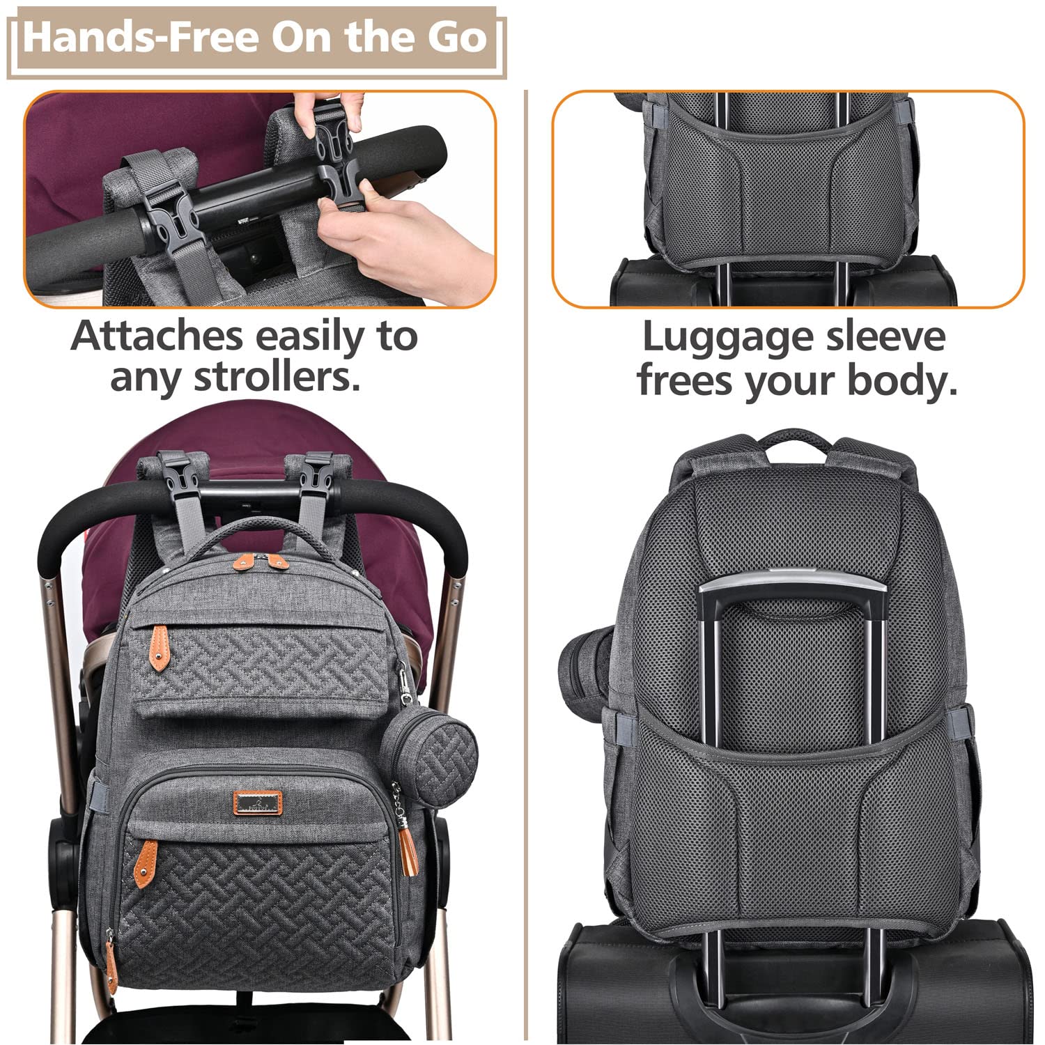 • Versatile & Convenient - This unisex baby bag can be used as a backpack, handbag, or hung on a stroller via the built-in detachable pram clips. Elegant and suitable for many occasions like shopping, traveling, etc. In addition, there is a luggage strap on the back which can easily slide over any carry-on luggage handle to allow for hands-free travel.