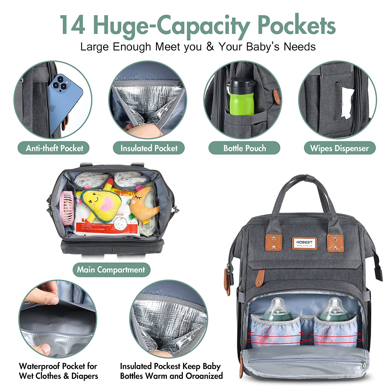 • {Large Capacity, Thermal Insulation} Featuring 14 usage pockets, each pocket of the diaper bag is independent for organizing the baby stuff and fetching out what you need in a clean and orderly manner. The multinational changing pad pocket holds tablets and laptops up to 15.6 and one anti-theft pocket in back is designed for phones, keys and cards. 2 insulated pockets fit for all major baby bottles and keep the bottles warms while the 4 elastic side pockets hold wipes,tissues,diapers, etc.
