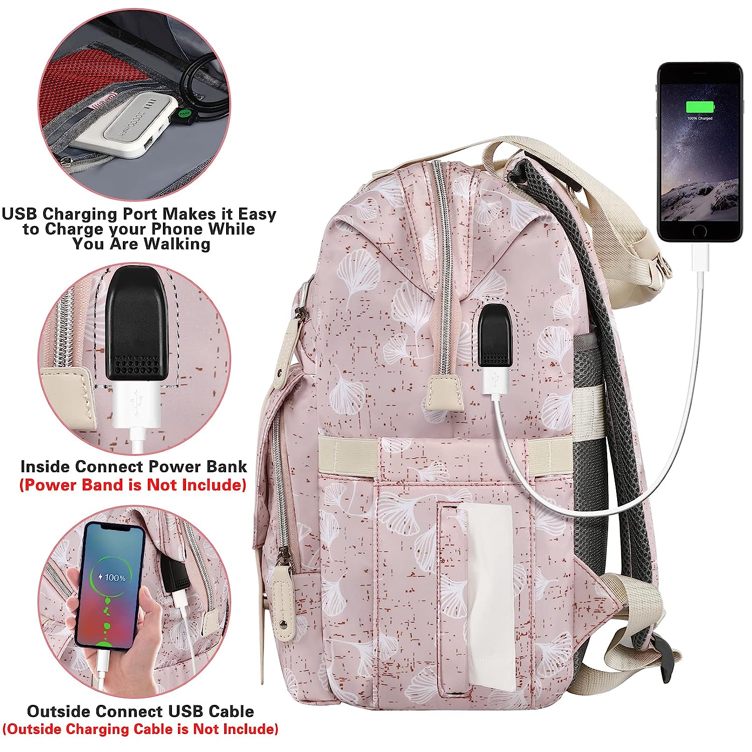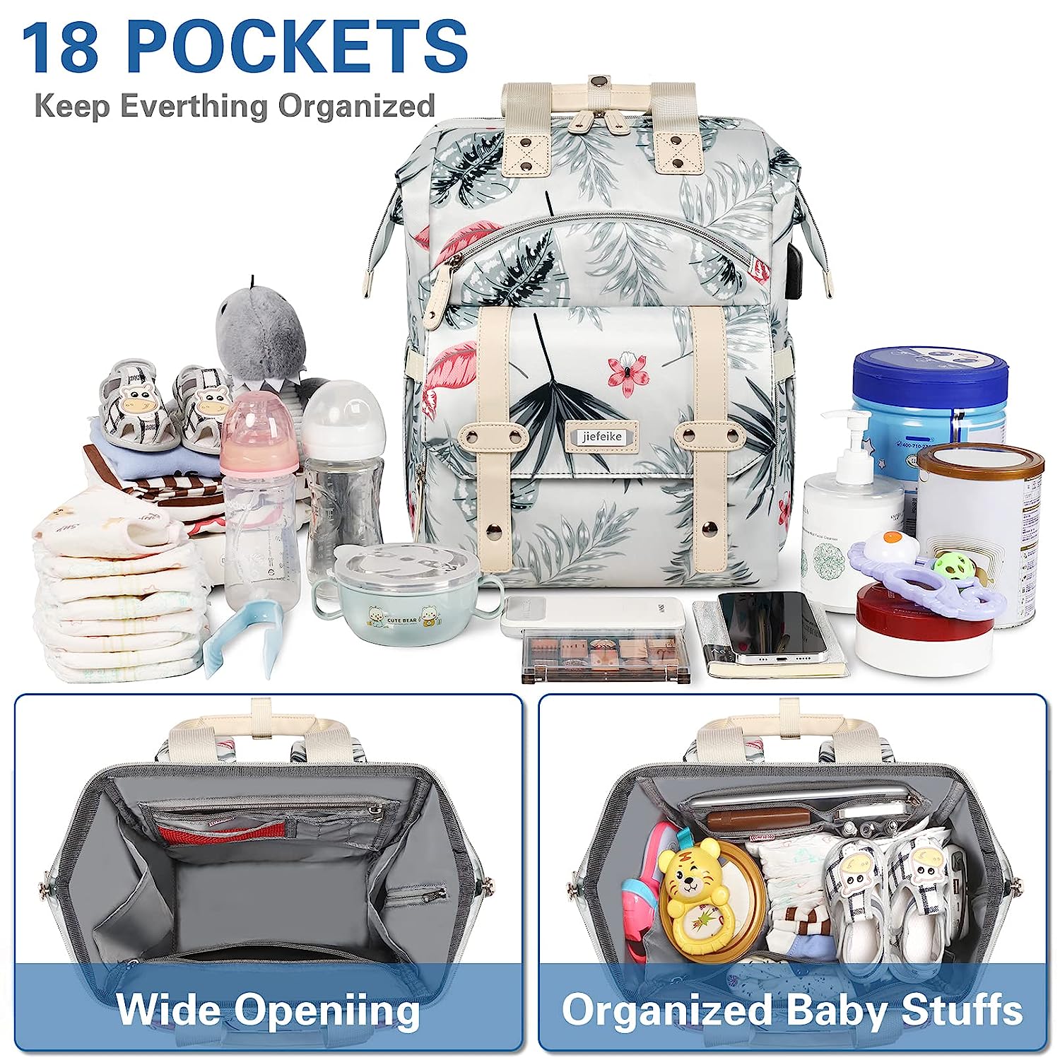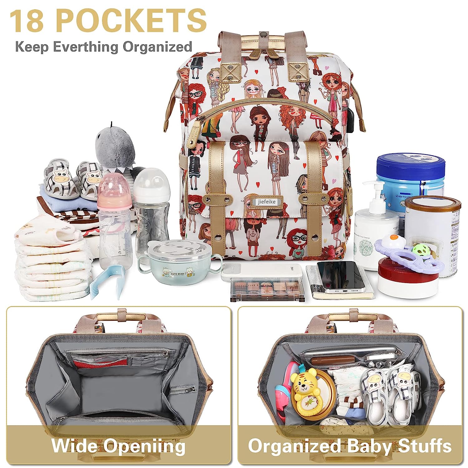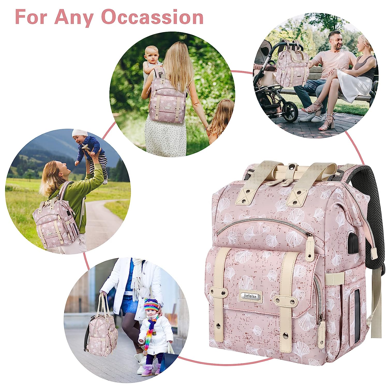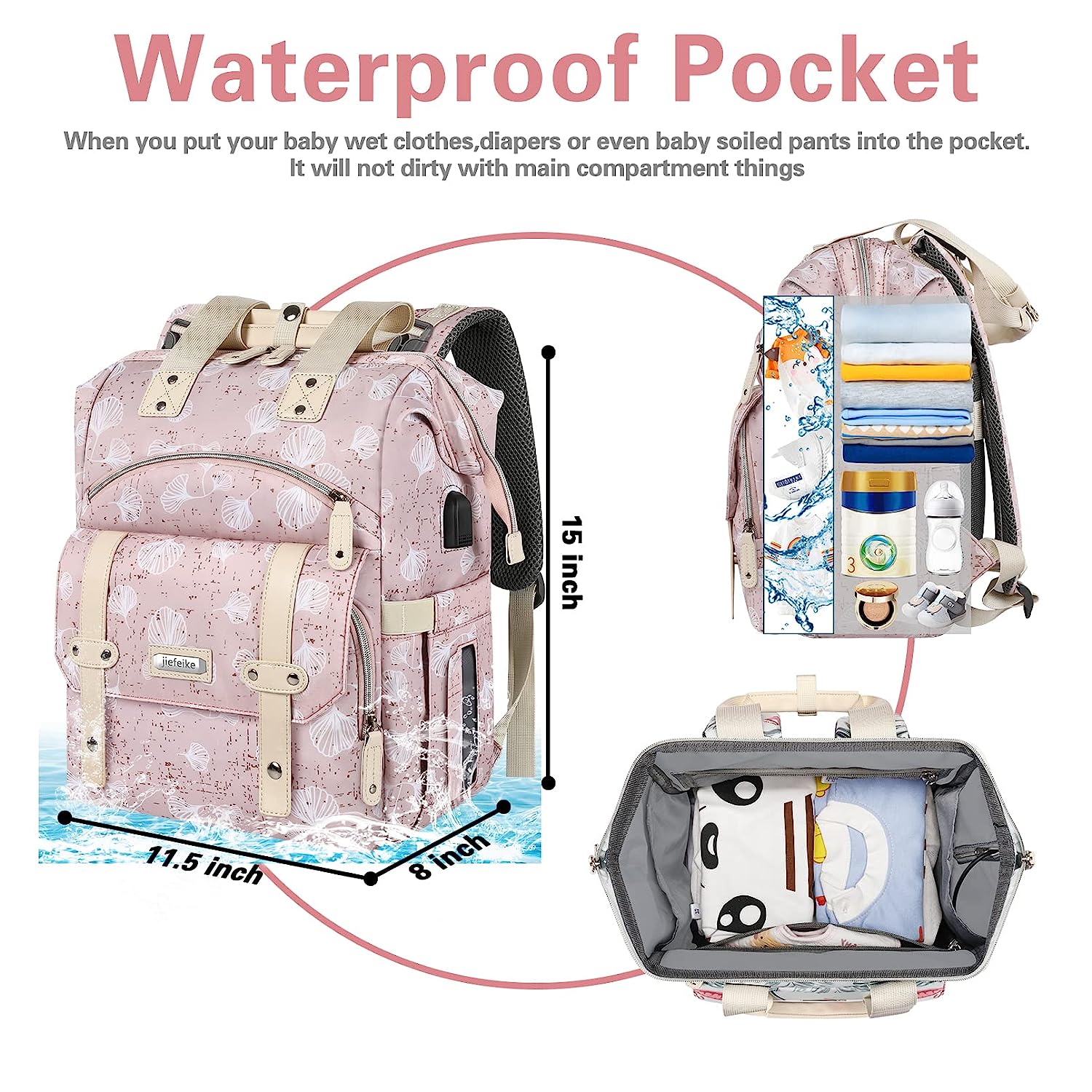 Jiefeike Diaper Bag Backpack,Baby Boys Girls Travel Backpack Diaper Bag for Dad Mom,Insulated Pockets Portable Pink Baby Nappy Bags with USB Charging Port,RFID Anti-Theft Pocket Stroller Straps