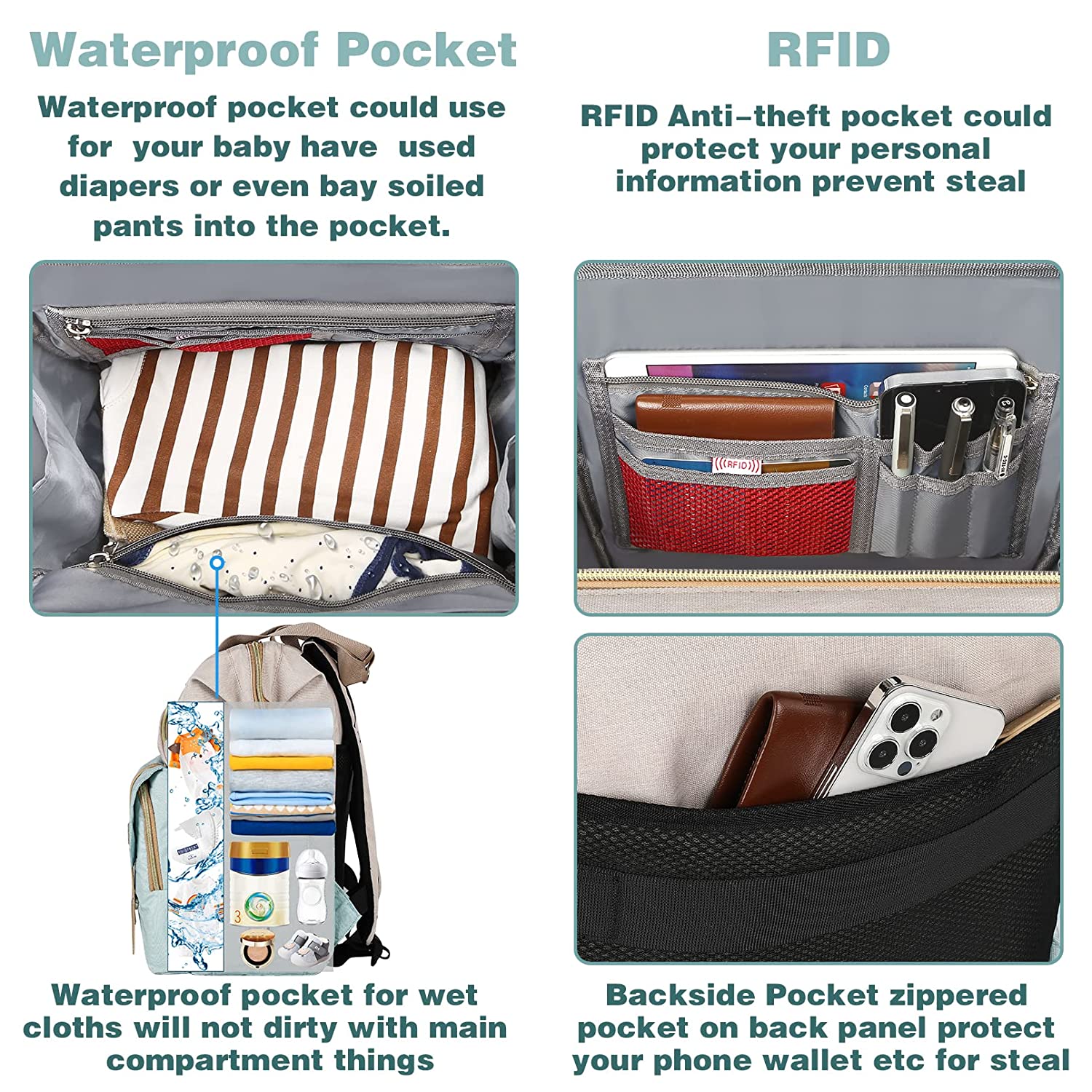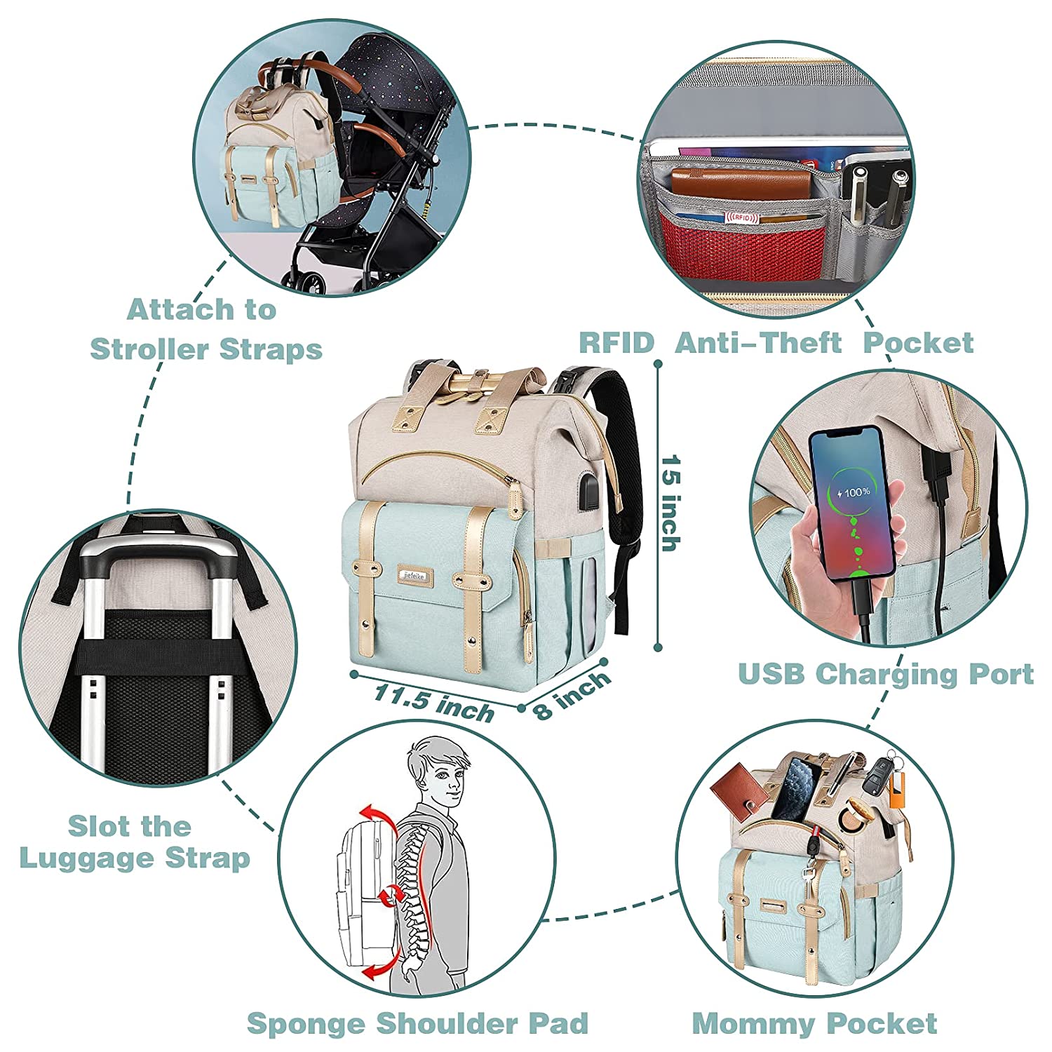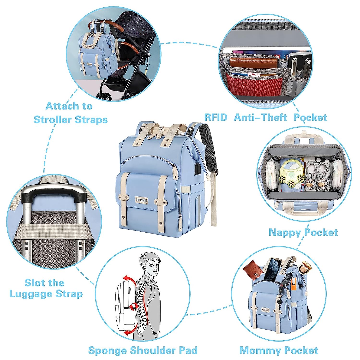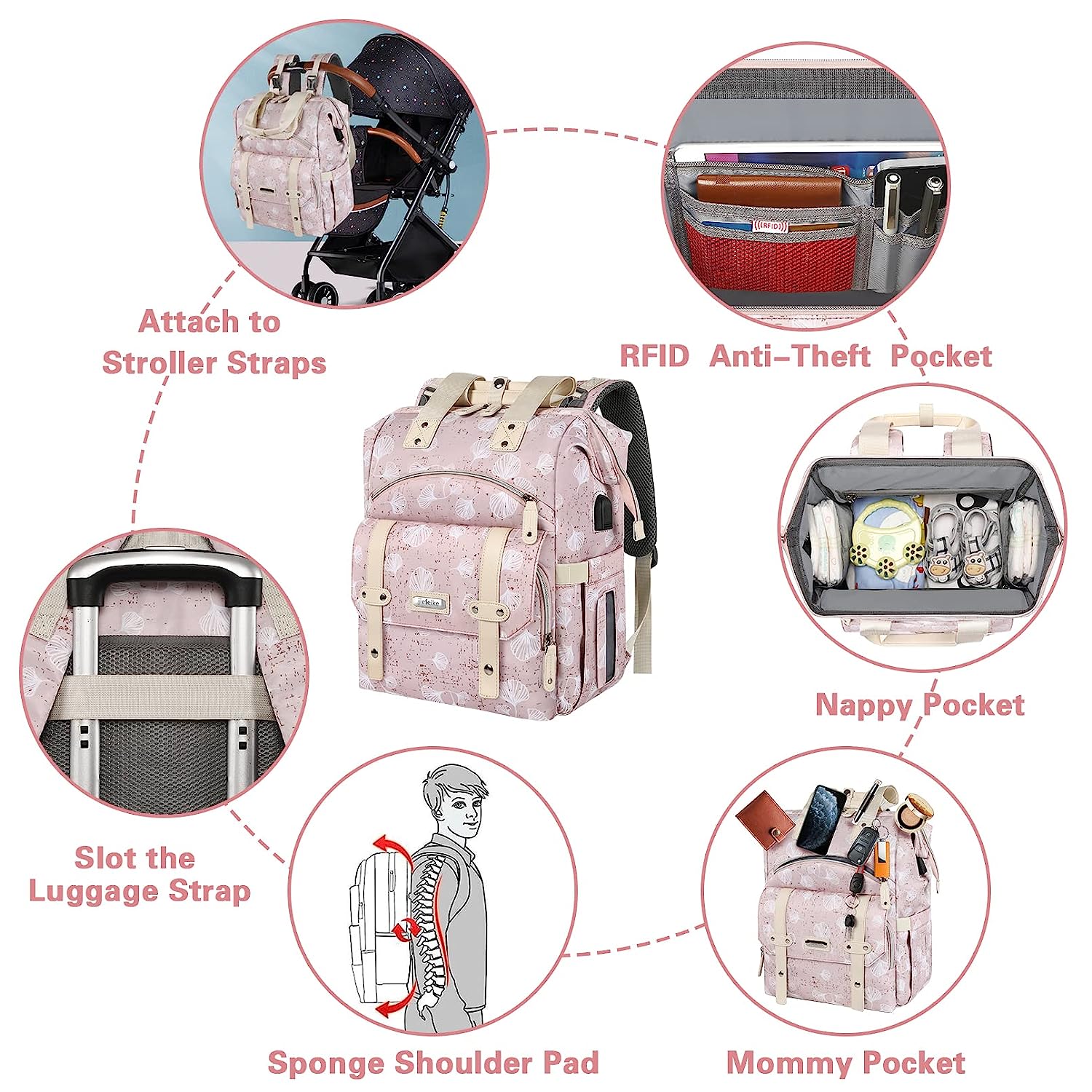 • ?【Diaper Bags Large Capacity】Diaper bags for baby girl has 2 insulated pocket for baby bottle.1 mommy pocket store daily thing.Diaper bags main compartment could hold most of baby essentials.Also have 1 organizer pocket for nappy,1 RFID pocket and 1 Dry and wet separation bag convenient for you go outside.1 USB charging port.2 side pocket for easy reach wipes,water bottles or umbrella.The luggage Strap allows you to fasten to the suitcase and easy to carry.Best Valentine's gift for women