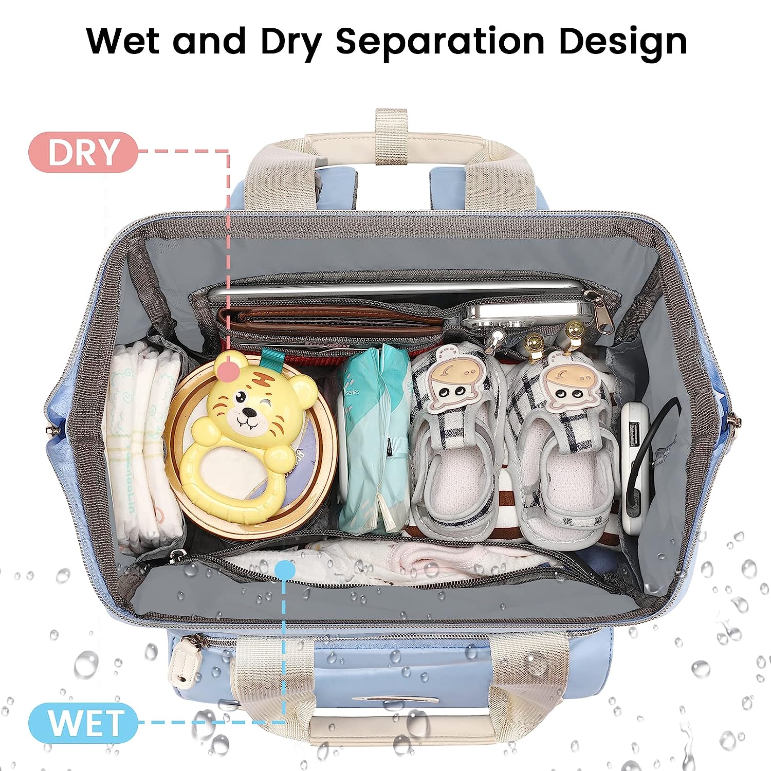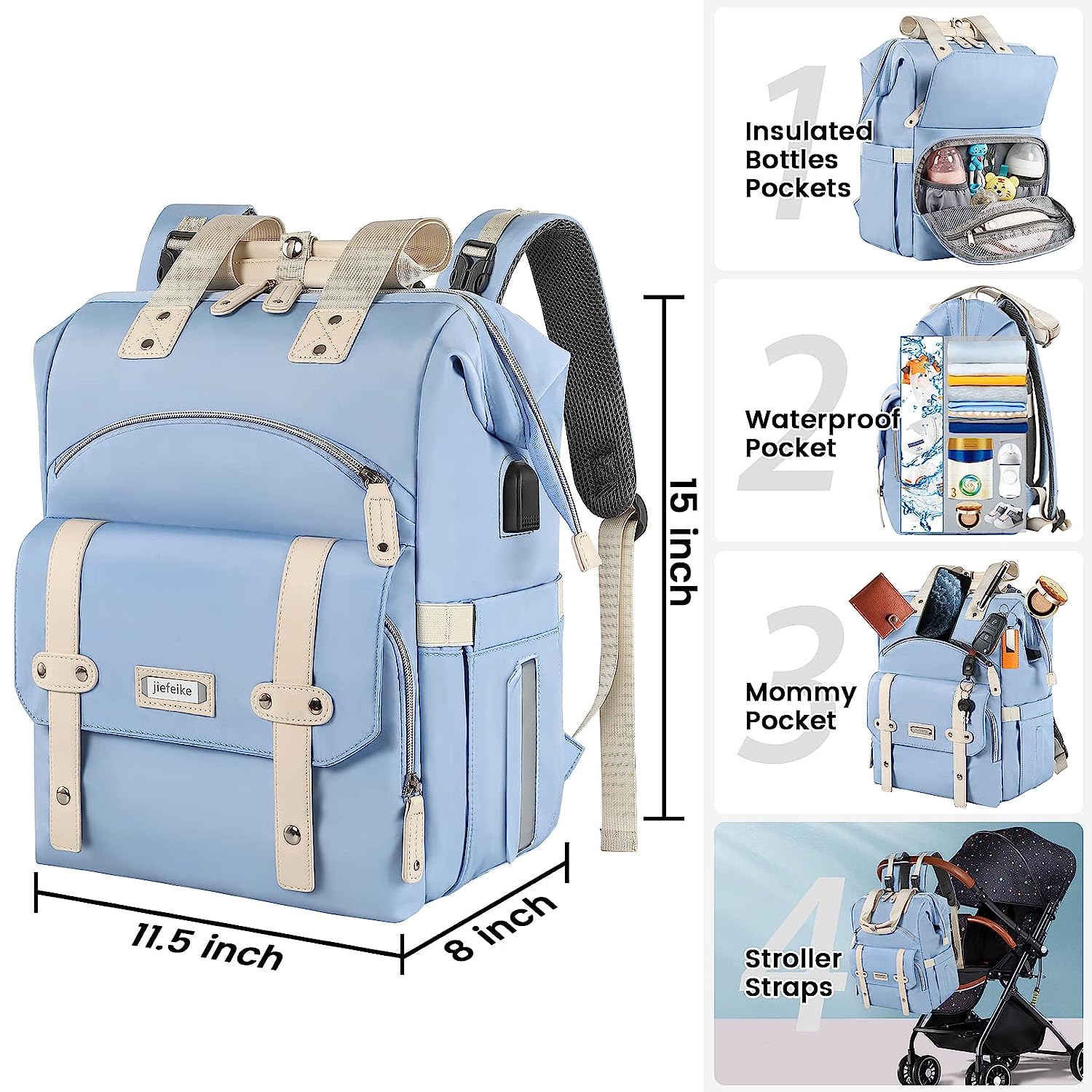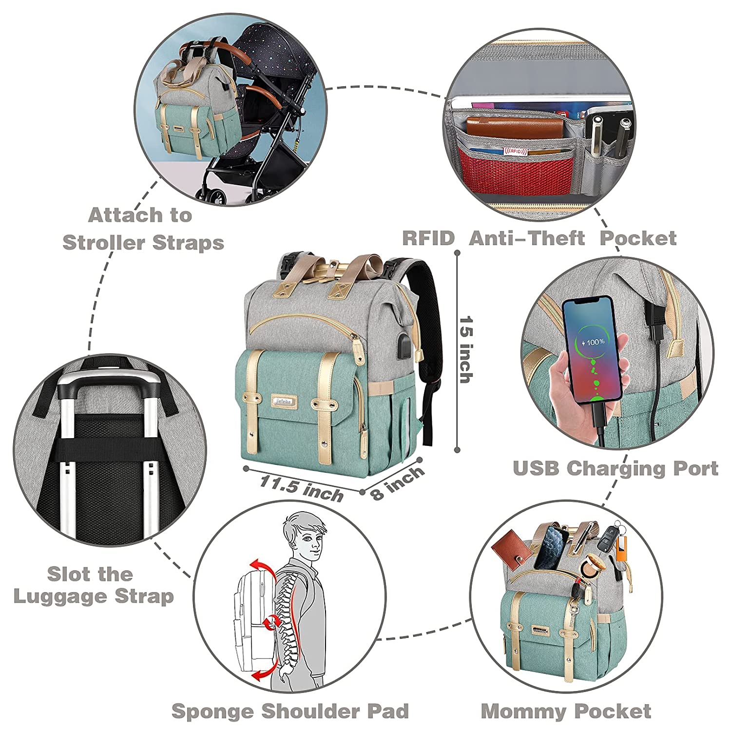 • ?【Diaper Bags Large Capacity】Diaper bags for baby girl has 2 insulated pocket for baby bottle.1 mommy pocket store daily thing.Diaper bags main compartment could hold most of baby essentials.Also have 1 organizer pocket for nappy,1 RFID pocket and 1 Dry and wet separation bag convenient for you go outside.1 USB charging port.2 side pocket for easy reach wipes,water bottles or umbrella.The luggage Strap allows you to fasten to the suitcase and easy to carry.Best Valentine's gift for women