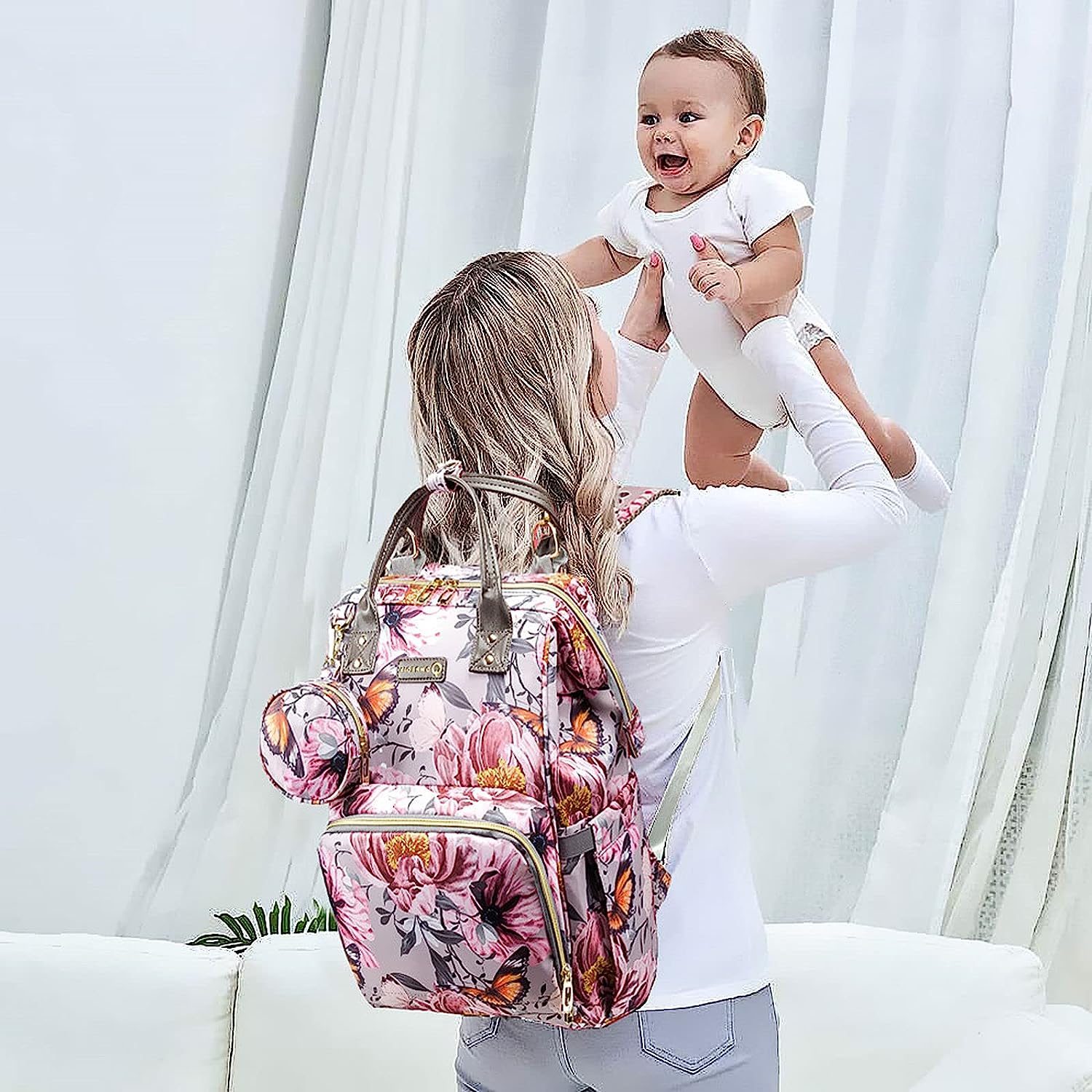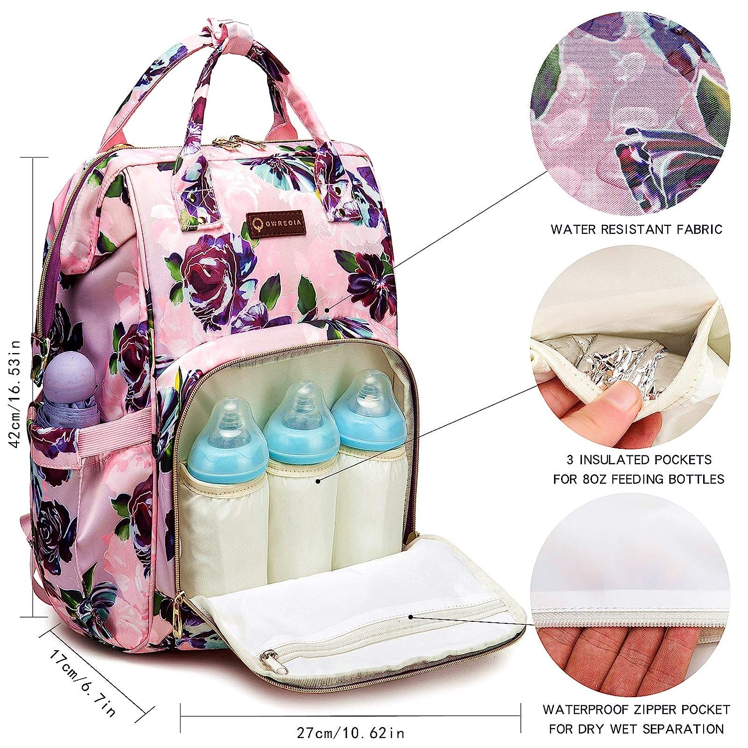 QWREOIA Floral Diaper Bag Backpack with Coin Bag USB Charging Port Stroller Straps and Insulated Pocket,Travel Nappy Backpack For Women/Mom (Grey Pink Flower Pattern)
