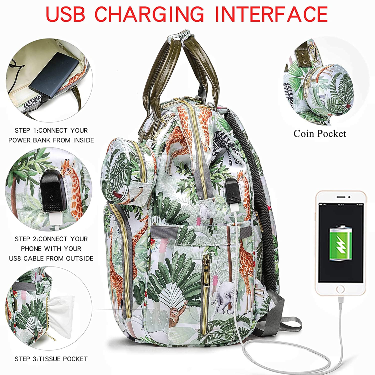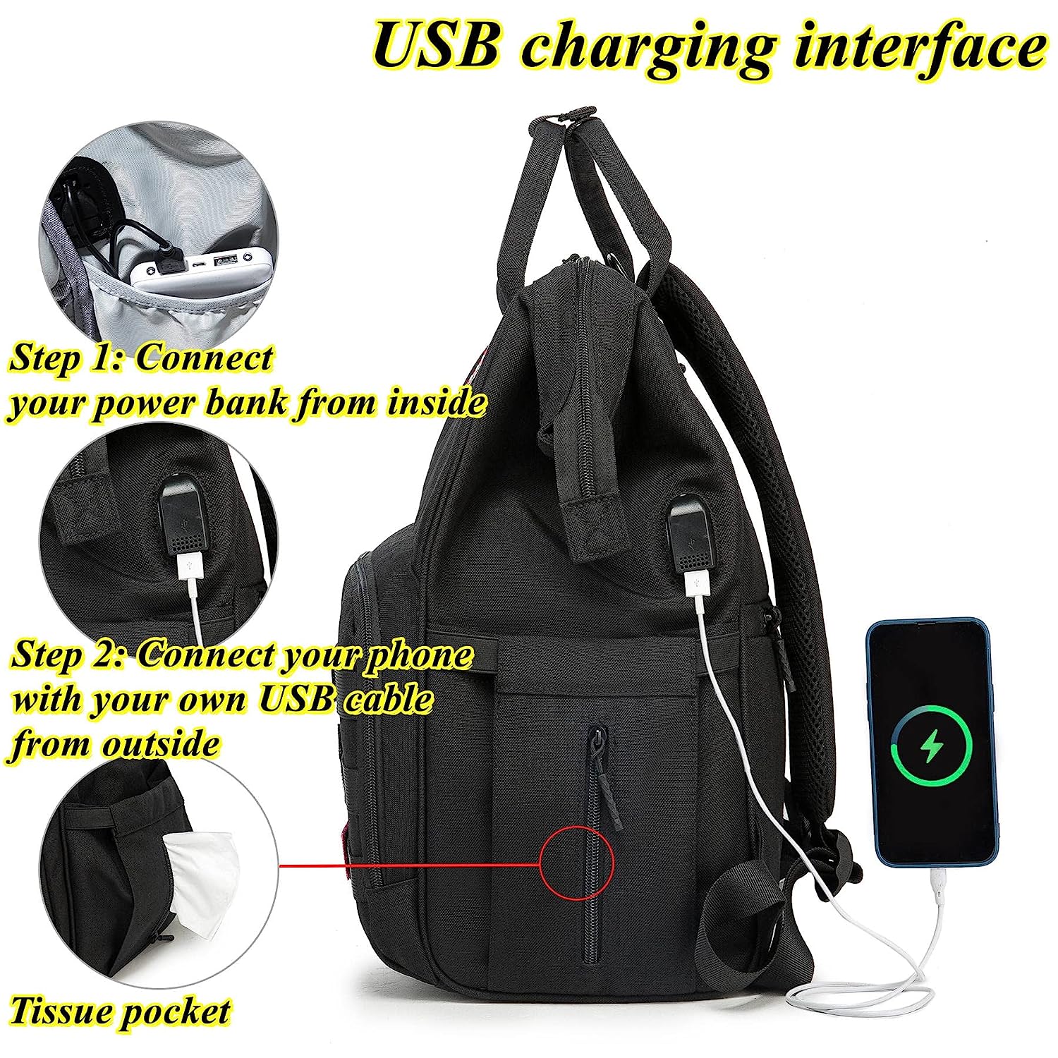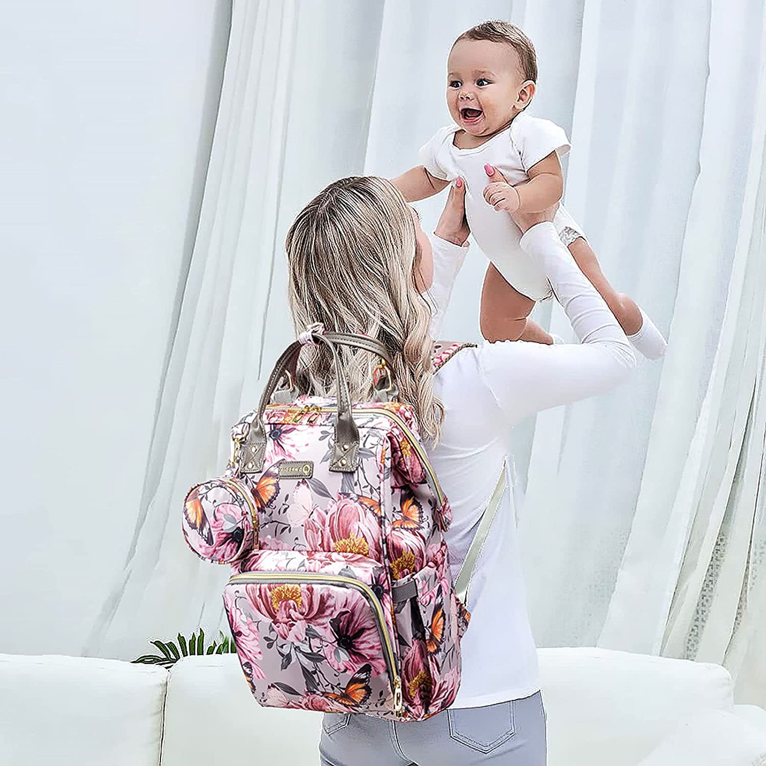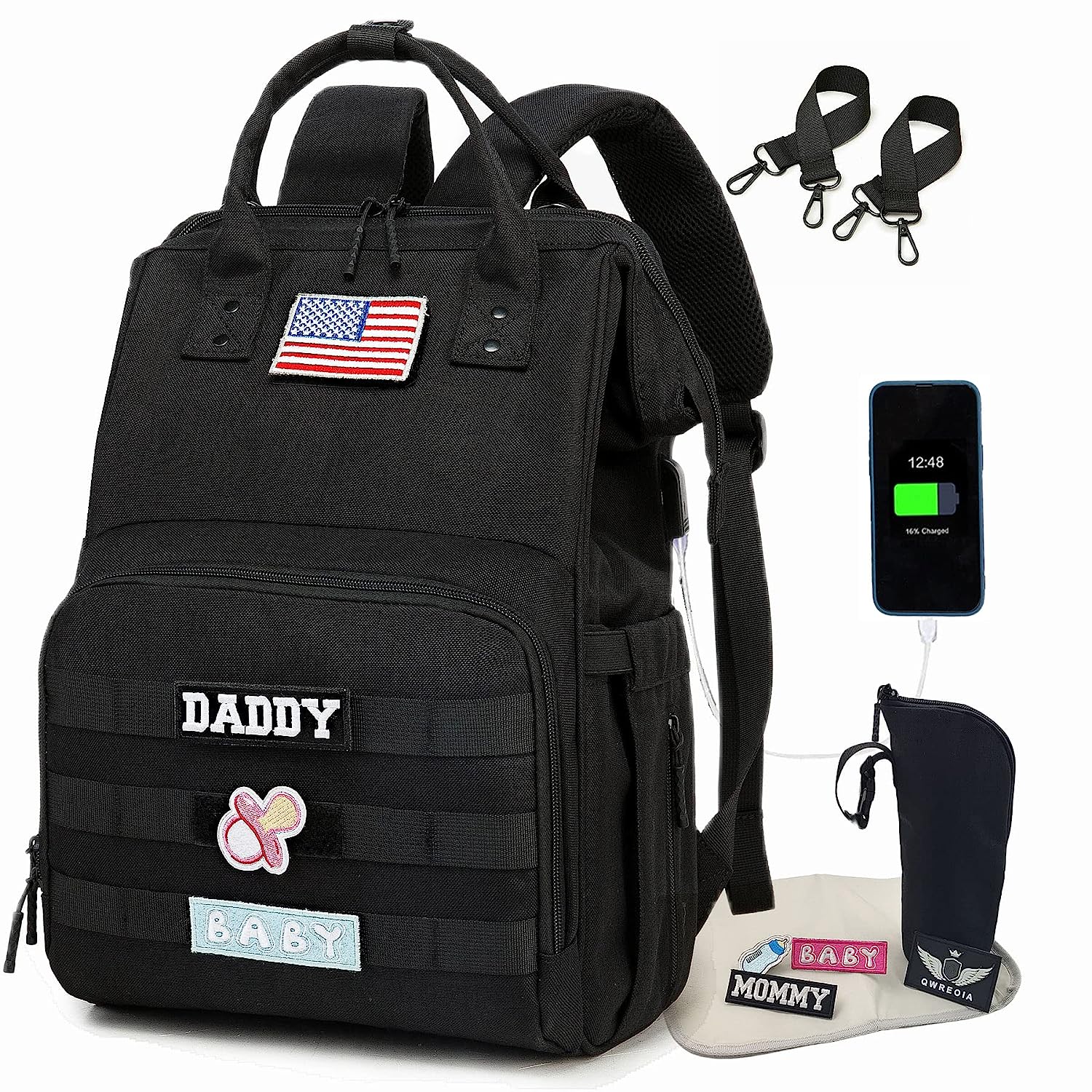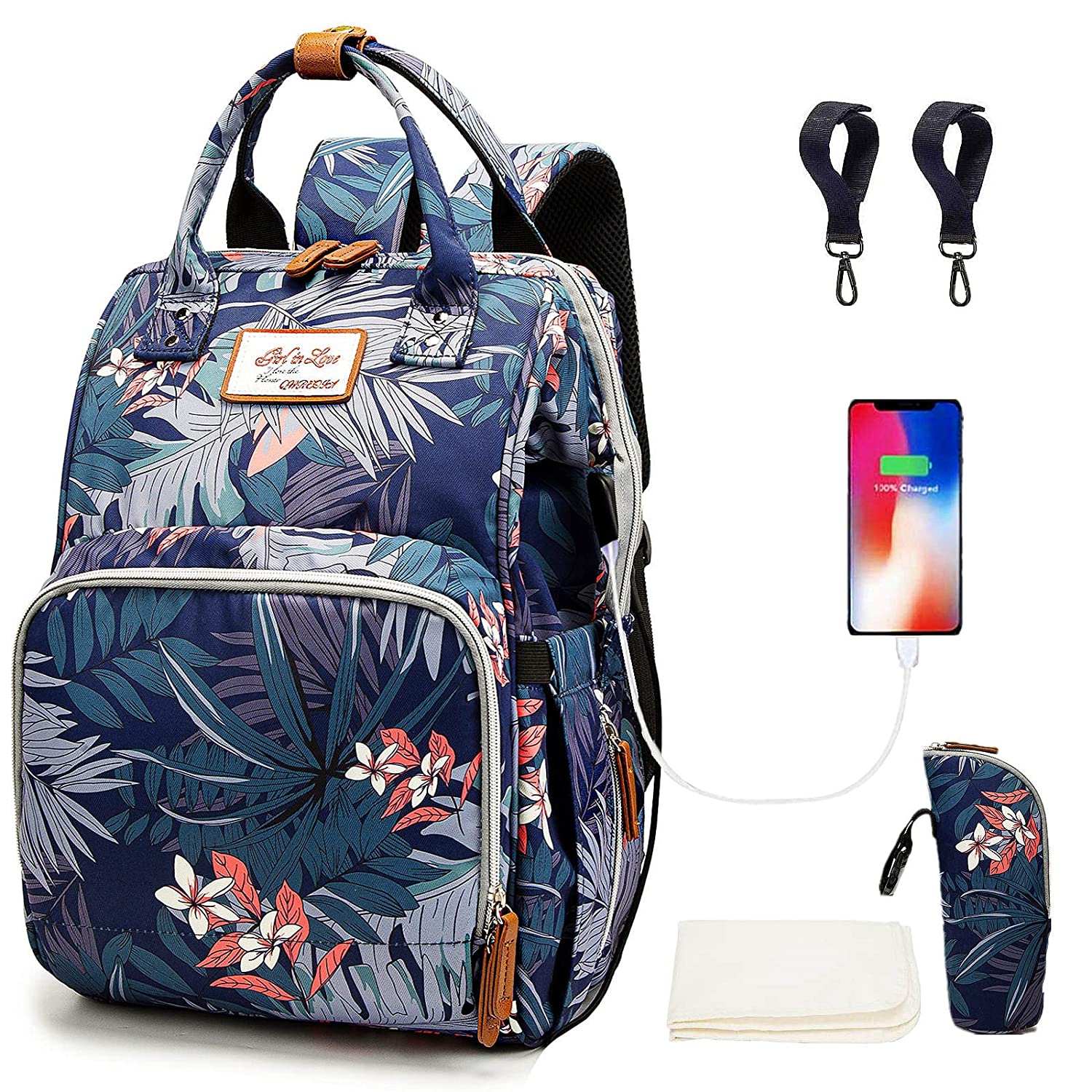 • ?Stylish & Convenient: Neutral Design Diaper Bag in Black with stylish print (flower pattern). Hands-free by the Stroller Straps, One-Hand Controlling via the Easy-taking Zipper and the Outside Pockets without Opening the Big Zipper. It has both shoulder strap and hand-held strap, so you can use it as backpack or tote bags according to your needs.