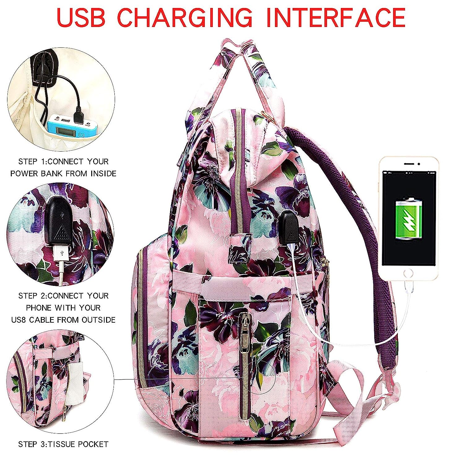 QWREOIA Floral Diaper Bag Backpack with USB Charging Port Stroller Straps and Insulated Pocket, Travel Bag Nappy Backpack For Women/Mum (Red Flower Pattern)
