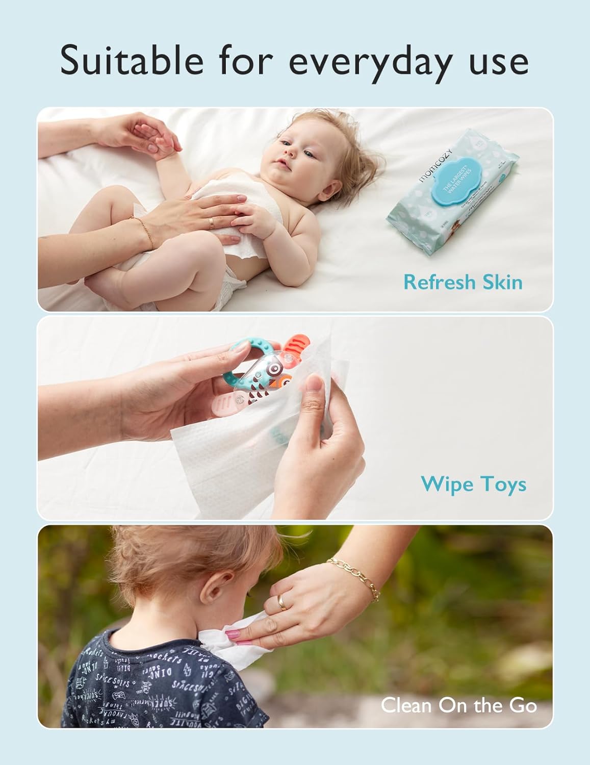 • 【Purest Ingredients, Gentlest Care】99% pure water and a drop of coconut extract, our baby wipes are gentle enough for sensitive newborn skin. Plus, they're hypoallergenic and fragrance-free, making them a perfect conditioner. Momcozy's advanced 7-step purification is for added safety.
