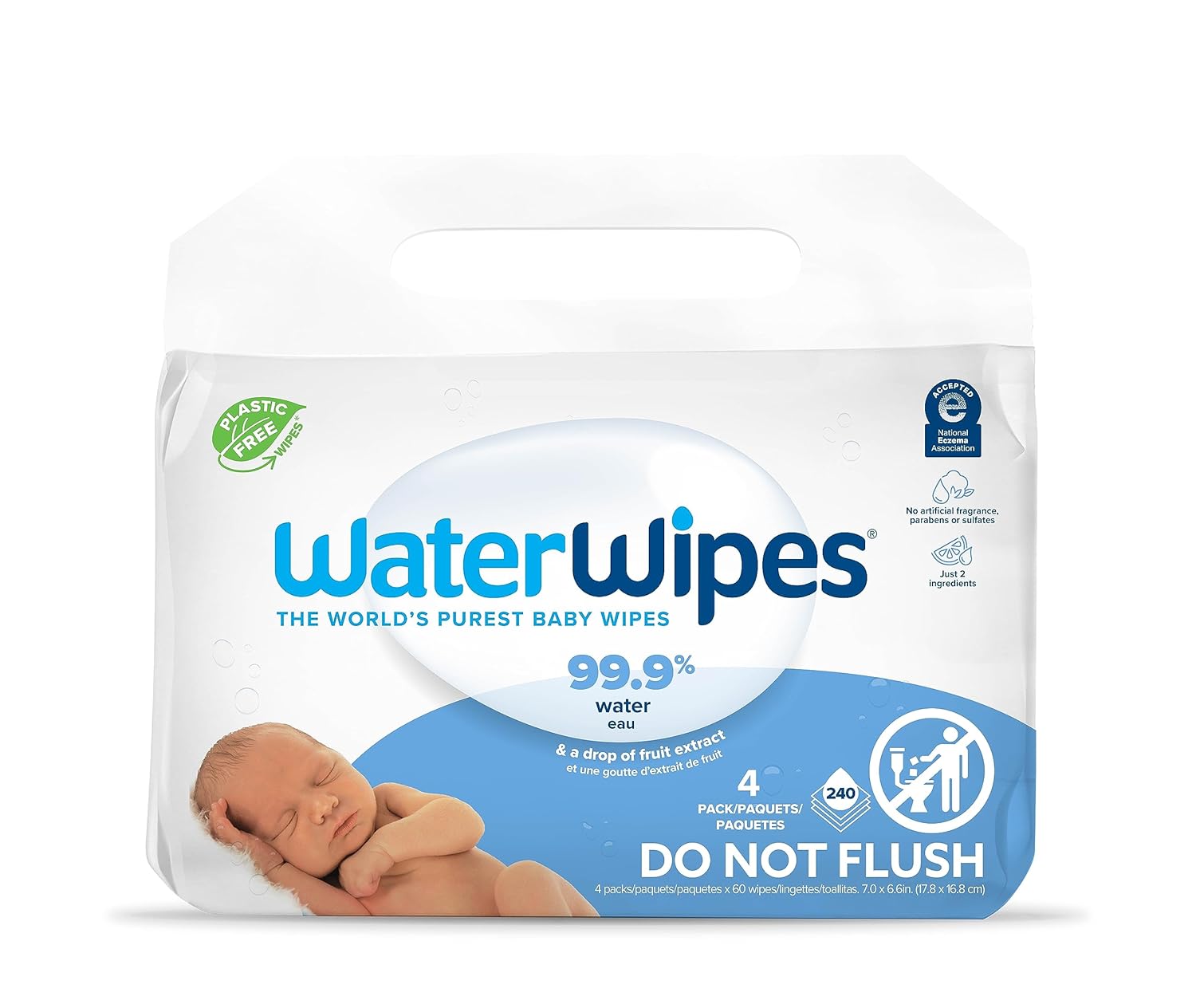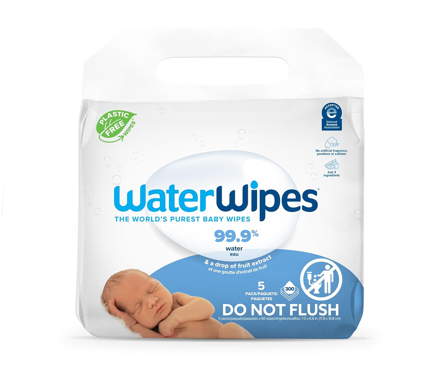 Families can trust WaterWipes Original baby wipes 300 Count (5 Packs) to gently clean and help protect sensitive skin. Our new Plastic-Free Original wipes are the same formula and purity as before, with just 2 ingredients: 99.9% ultra-purified water and a drop of fruit extract to naturally cleanse the skin.