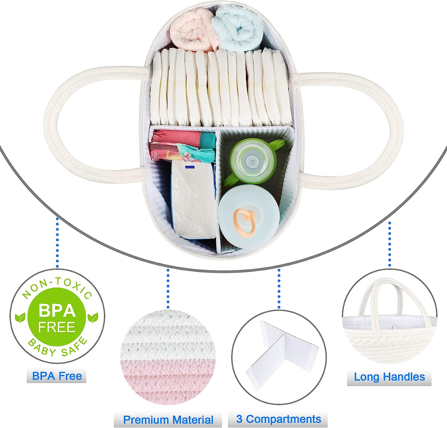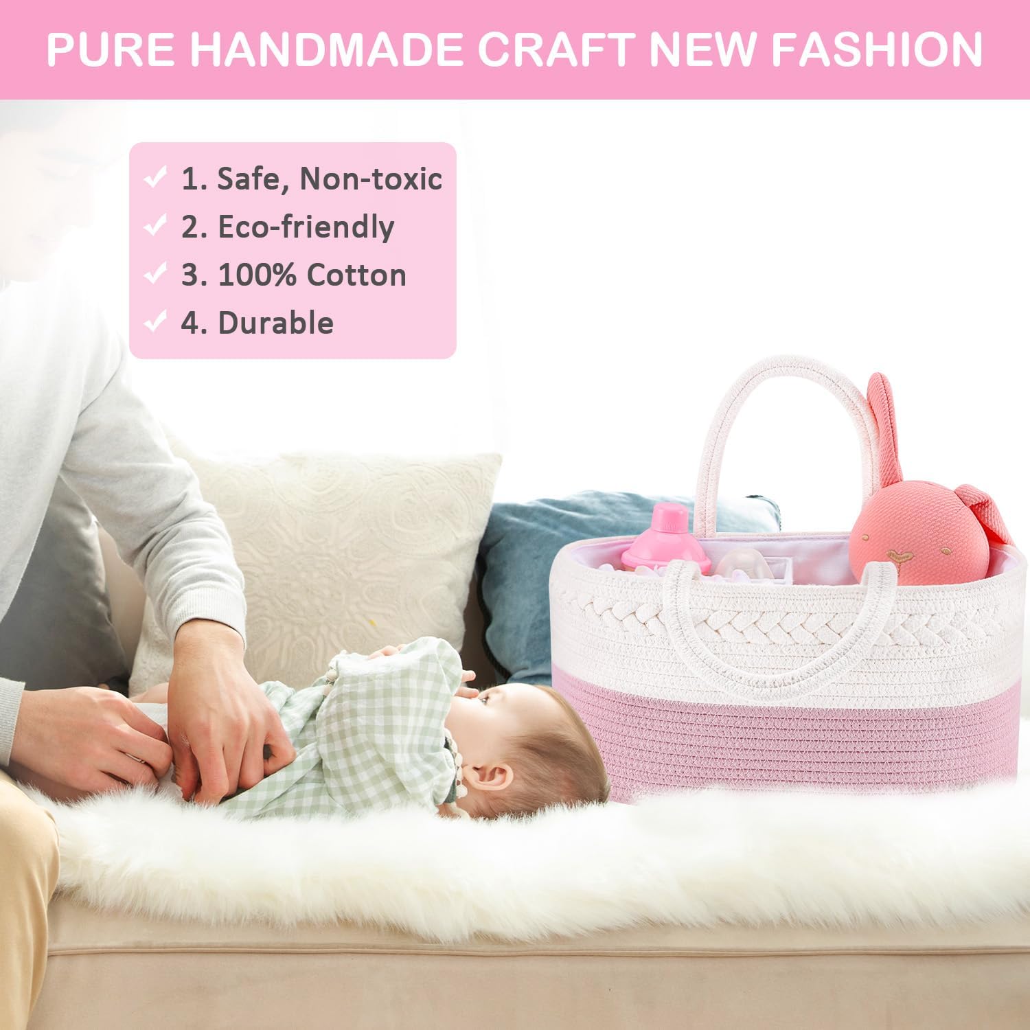 • Premium diaper caddy is made of 100% natural cotton rope, soft and safe for your baby. Durable and sturdy, simple and practical design suitable for boys and girls