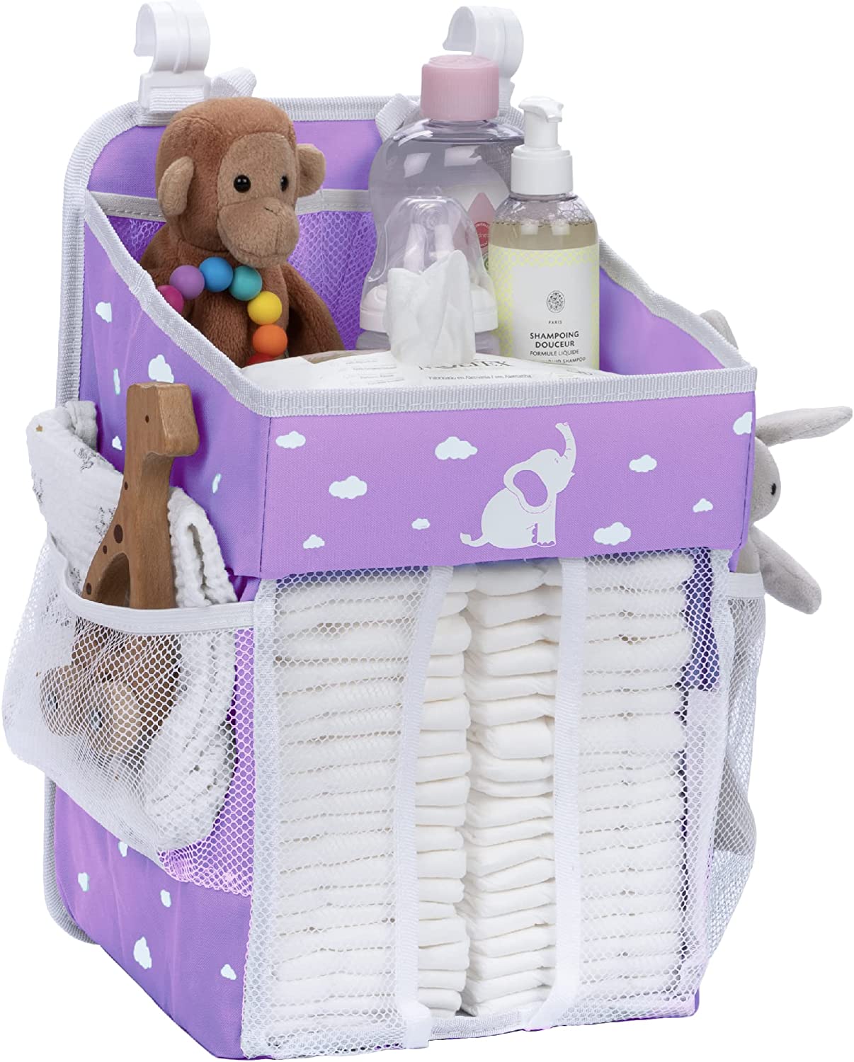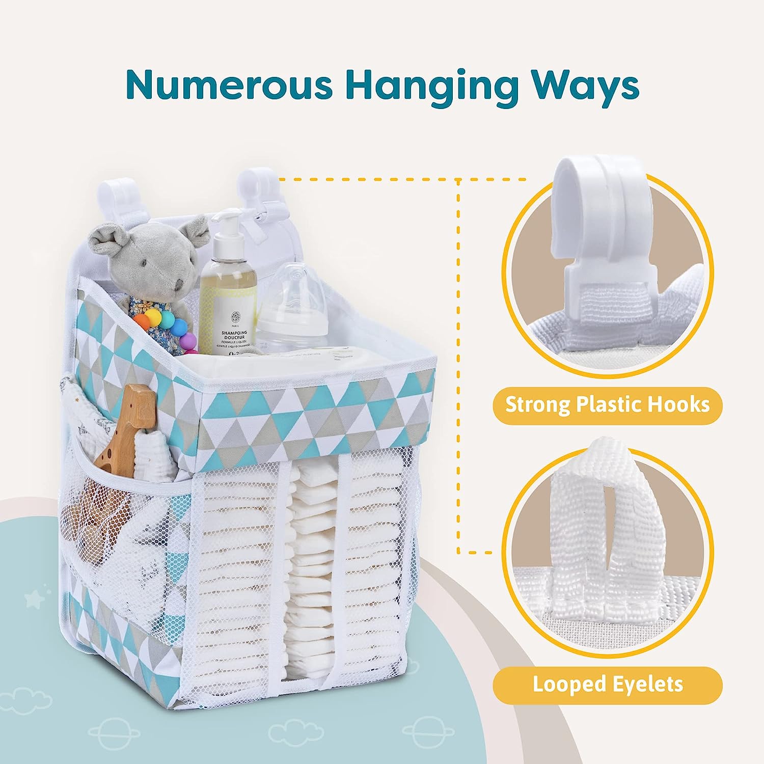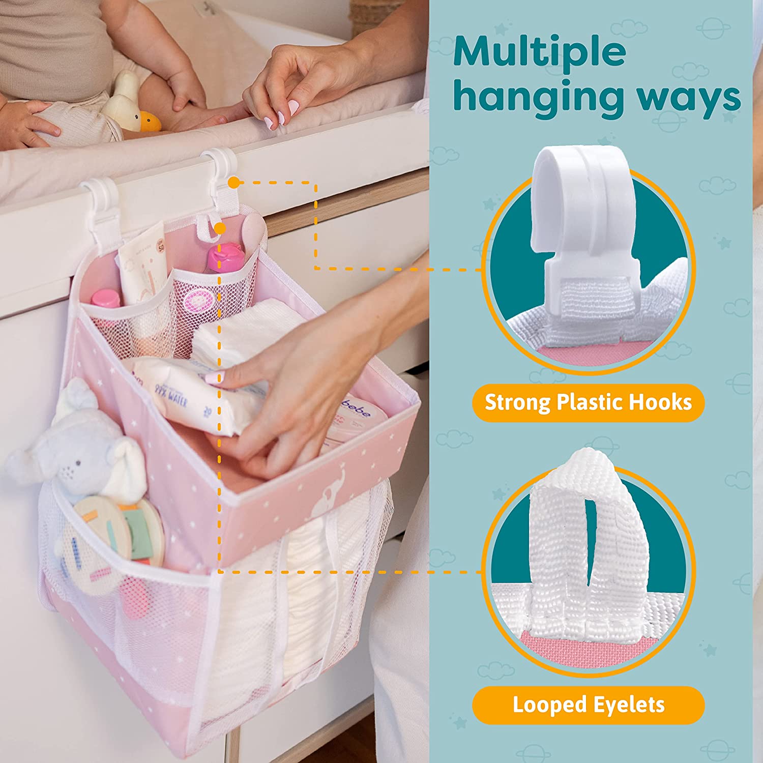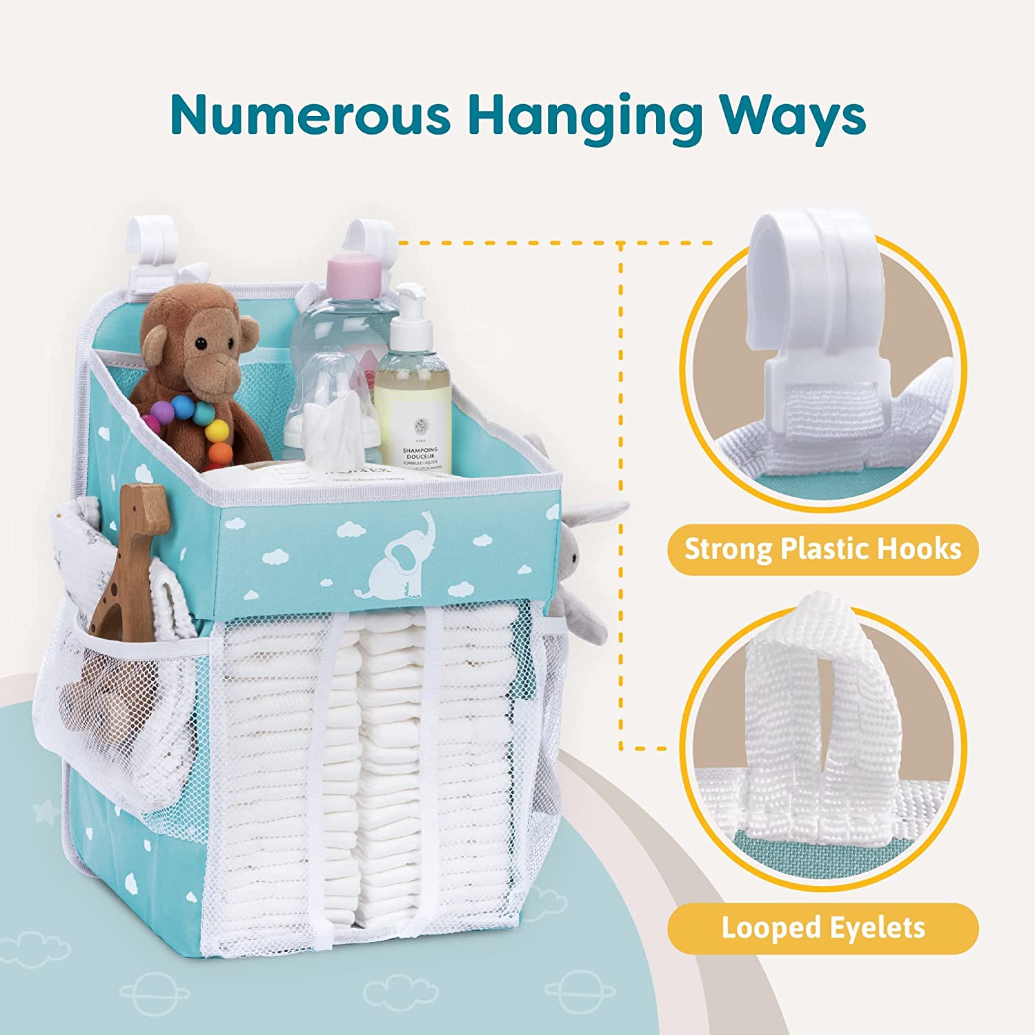 • MULTIPLE HANGING WAYS - Whether you are looking for a convenient diaper holder for your home or for travel, this hanging diaper organizer offers the perfect solution. With its 2 hooks and 2 eyelets, the diaper change organizer can be hung just about anywhere