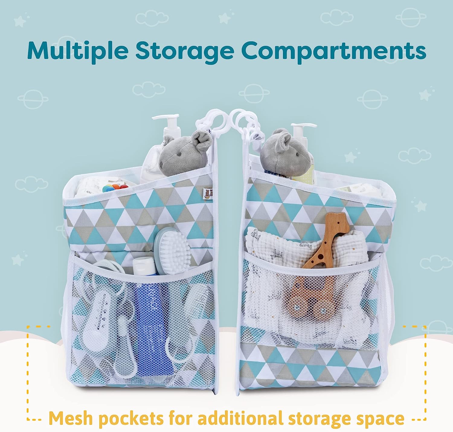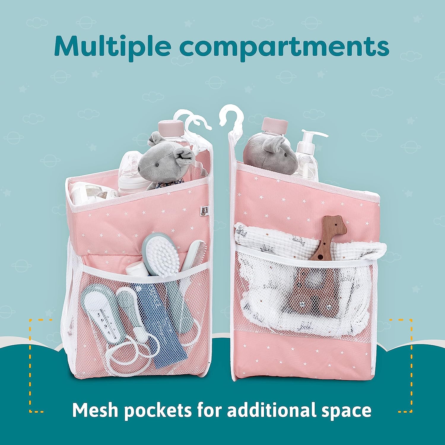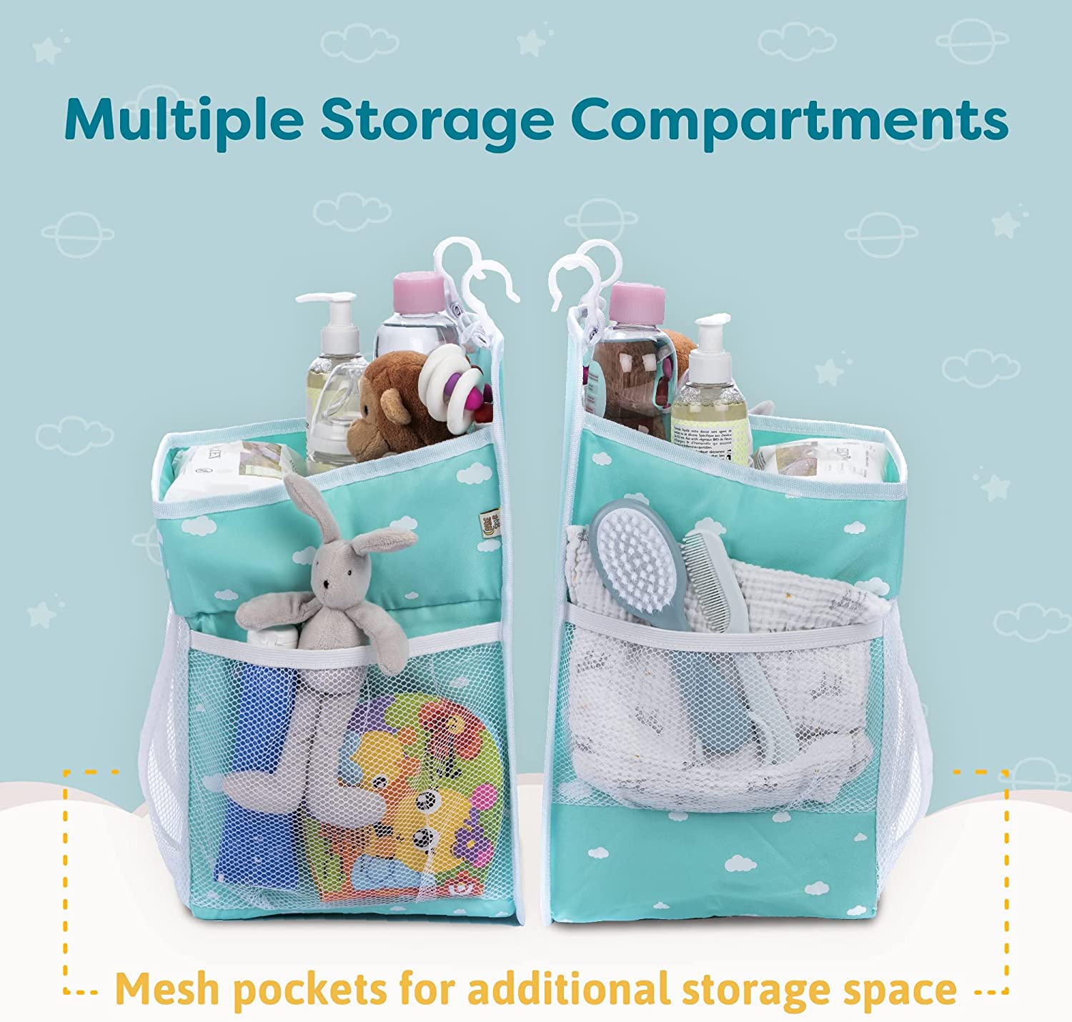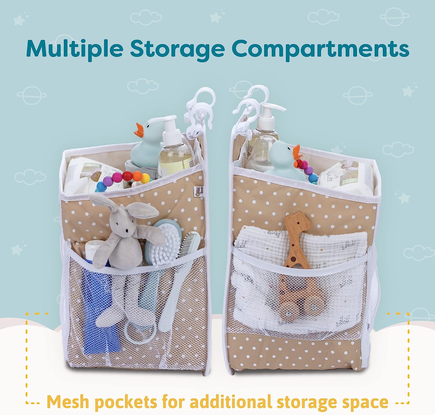 • MULTIPLE HANGING WAYS - Whether you are looking for a convenient diaper holder for your home or for travel, this hanging diaper organizer offers the perfect solution. With its 2 hooks and 2 eyelets, the diaper change organizer can be hung just about anywhere