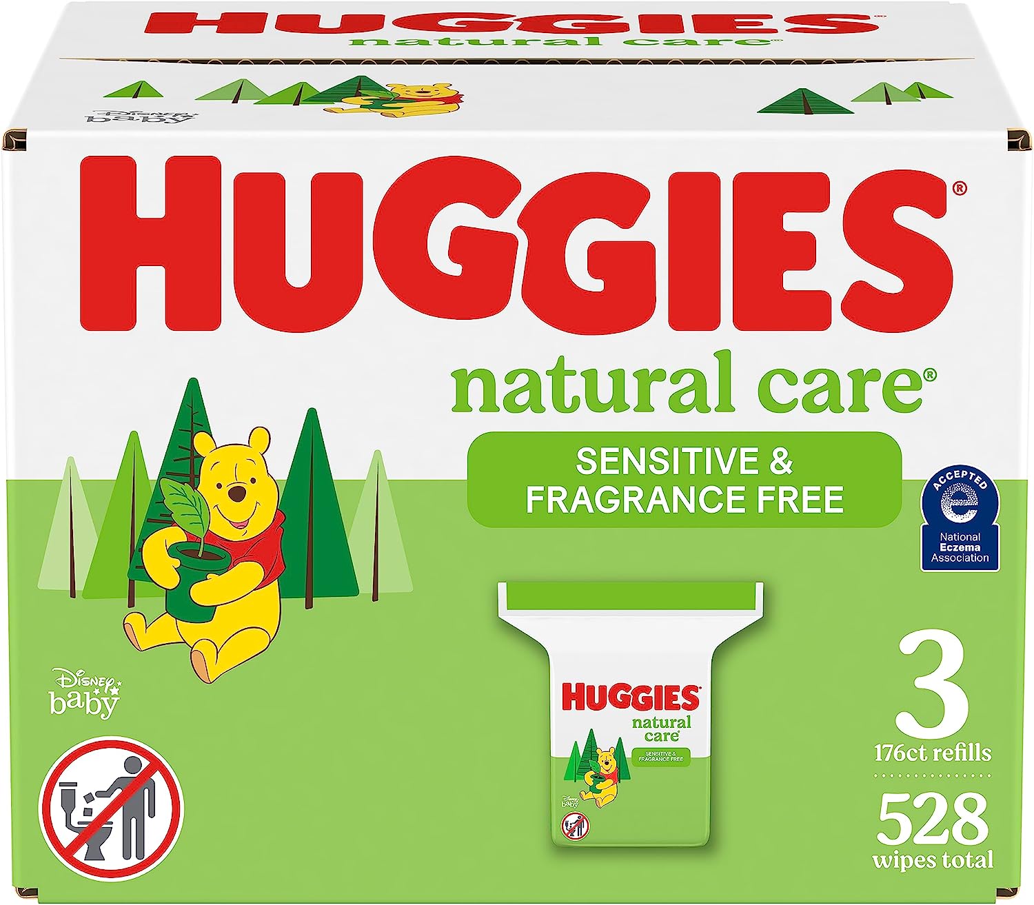 Huggies Natural Care Sensitive Baby Wipes gives your baby an extra soft and gentle clean with every wipe. Made with 99% purified water and 1% skin essential ingredients, these baby wipes have reliably offered you plant-based ingredients for over 20 years. The unique base sheet is infused with aloe and vitamin E and keeps your baby's skin clean by locking in and absorbing the mess. To help maintain healthy skin for your baby, the Huggies Natural Care unscented disposable wipes are hypoallergenic, dermatologist-tested and pH-balanced. They're recognized by the National Eczema Association because they're fragrance free, alcohol free, paraben free and do not contain phenoxyethanol or MIT, making them safe for sensitive skin. Coming in adorable Winnie-the-Pooh-inspired packaging, each wipe is extra soft and gentle, making them ideal for sensitive newborn skin. Plus, with a flip-top design and EZ Pull 1-Handed Dispensing, you can easily grab wipes without wasting sheets. With the #1 branded wipe**, you can feel confident you are giving baby a safe, gentle clean every time. Join the Huggies Rewards Powered by Fetch to get rewarded fast. Earn points on Huggies diapers and wipes, in addition to thousands of other products to redeem for hundreds of gift cards. Check out the Fetch Rewards app to get started today! (*70%+ by weight) (**Based on US Nielsen data ending 9/4/2021)