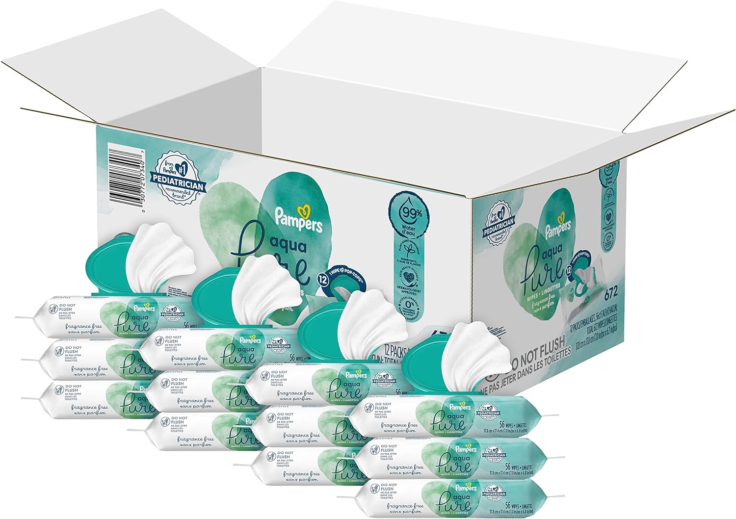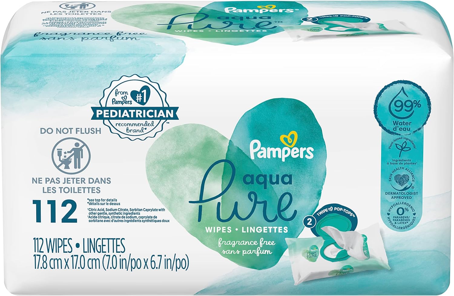 Our simplest formula, Pampers Aqua Pure baby wipes are made with 99% purified water. Perfect for sensitive skin, Aqua Pure water wipes are hypoallergenic and free of alcohol, fragrance, parabens and latex* for a soft and gentle clean. Aqua Pure wipes help restore skin’s pH better than the leading super-premium baby wipe. Plus, each pack includes our handy 1-Wipe POP TOP™, which keeps wipes from drying out. From Pampers, the #1 pediatrician recommended brand. For purely healthy skin, use Pampers Aqua Pure wipes together with Pampers Pure Protection diapers. (*No rubbing alcohol and no natural rubber latex)