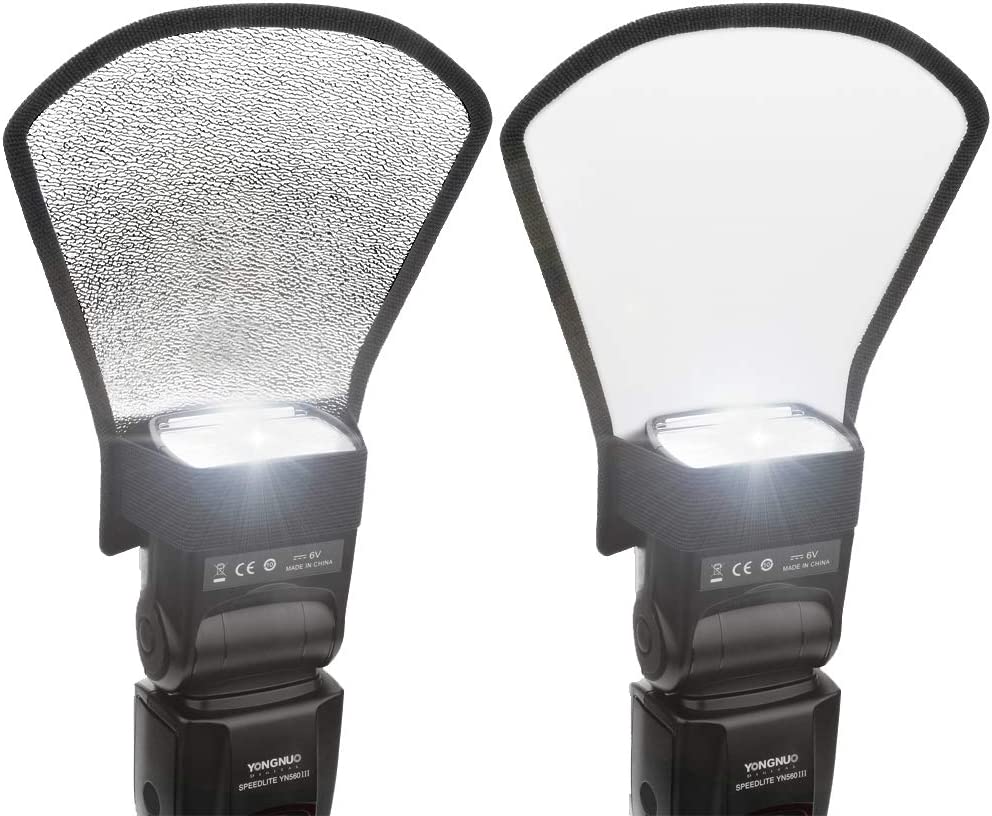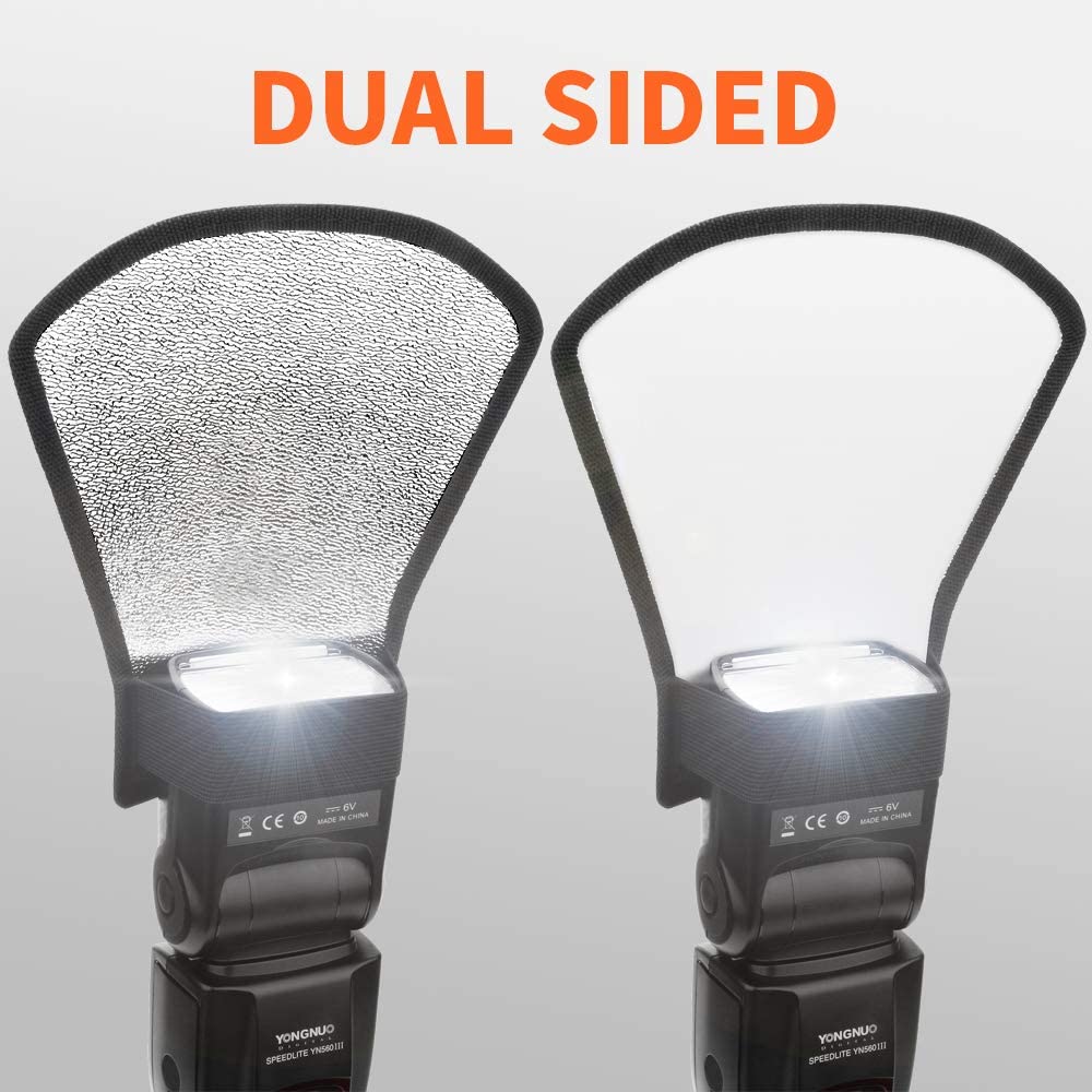 2 Pack Flash Diffuser Reflector - 2-Sided White/Silver Bend Bounce Flash Reflector Kit with Elastic Strap for Canon, Nikon, Sony, Fuji and All Speedlight Flashes