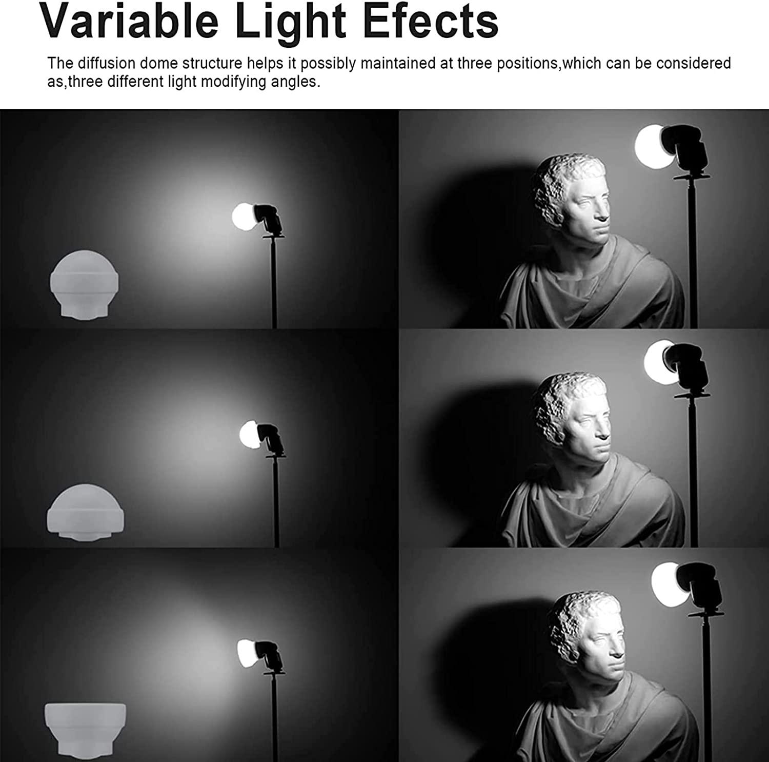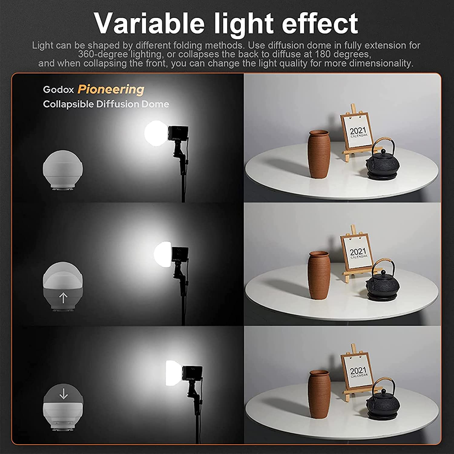 • 🏆【Variable light effect】Collapsible design supports several ways to shape light. Use a dome diffuser in full extension for 360-degree lighting, or collapses the back to diffuse at 180 degrees, and when collapsing the front, you can change the light quality for more dimensionality.