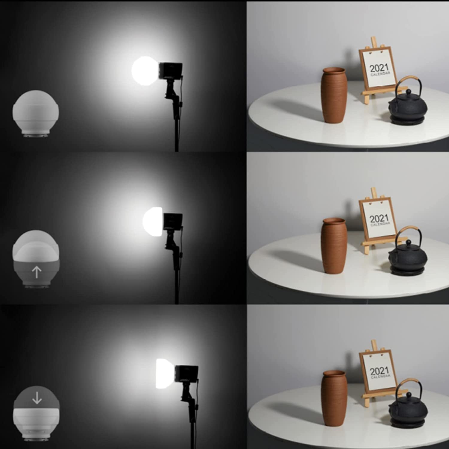 • 💡【More Possibilities than You Expect】Collapsible design opens several ways to shape light. Use a diffusion dome in fully extension for 360-degree lighting, or collapse the back to diffuse at 180 degrees, and when collapsing the front, you can change the light quality for more dimensionality.