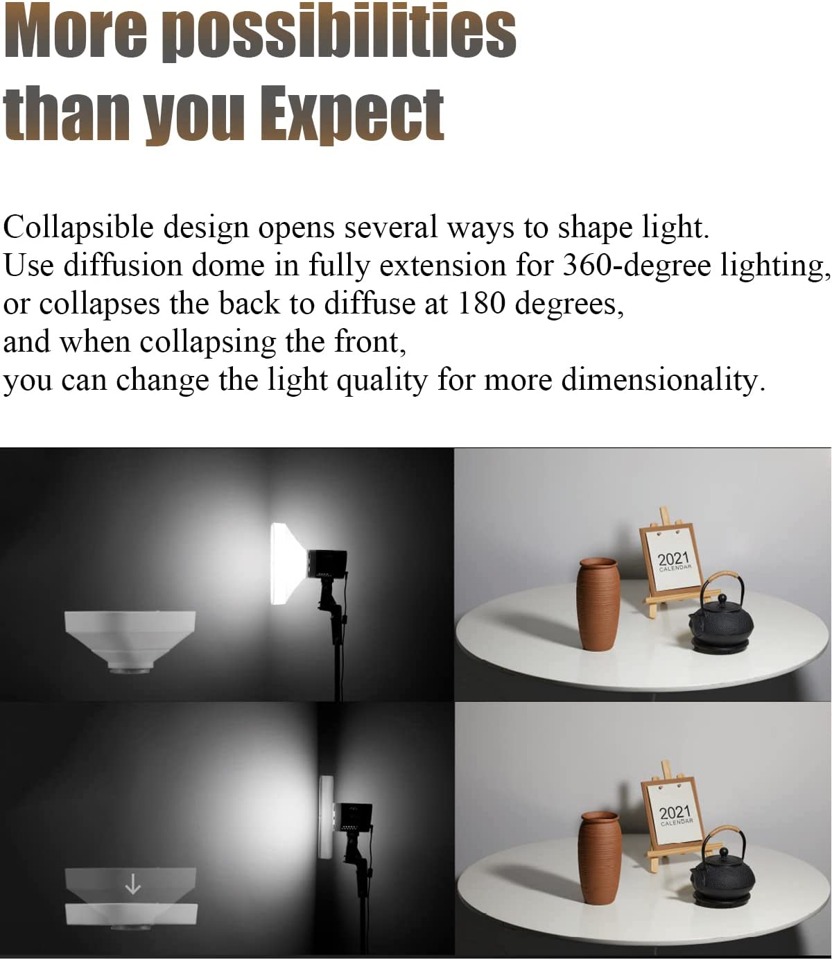 • 【More Possibilities than You Expect】:Collapsible design opens several ways to shape light. Use diffusion dome in fully extension for 360-degree lighting, or collapses the back to diffuse at 180 degrees, and when collapsing the front, you can change the light quality for more dimensionality.