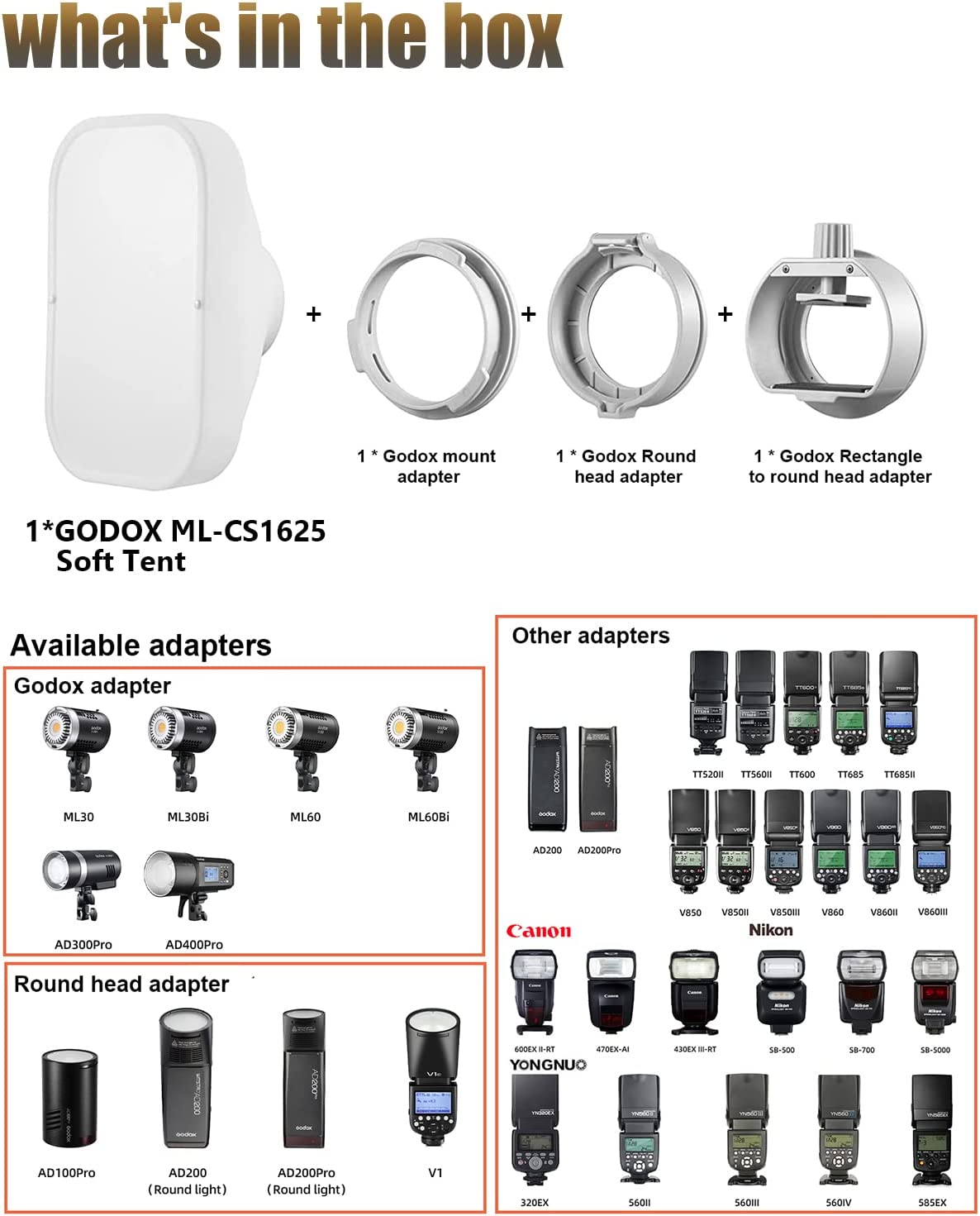• 【Package Included】: Godox ML-CD15 Diffusion dome*1; Godox mount adapter*1; Round head adapter*1; Rectangle to round head adapter*1 .