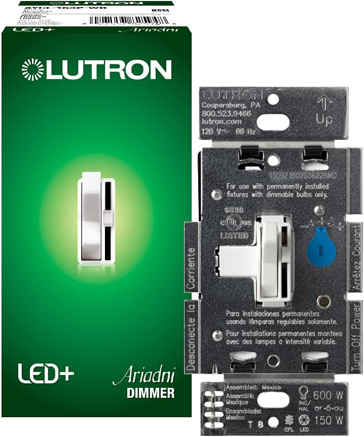 The Ariadni LED+ dimmer provides optimal dimming performance of LED bulbs. This dimmer works with up to 150-Watt of dimmable LED/CFL or 600-Watt of incandescent/halogen, allowing you to control multiple bulb types on the same circuit. It is designed to control a broad range of dimmable LED and CFL bulbs from a variety of brands including Philips, Cree, GE, EcoSmart and Lighting Science. The Ariadni dimmer features a toggle switch to turn your lights off or on- returning the lights to your favorite level. Adjust your light to any activity using the discreet slide control next to the switch. Coordinating wall plate sold separately.