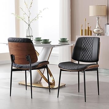 BV Dining Chairs Set of 2, PU Leather Armless Kitchen Chair in Modern Walnut Style, Mid Century Bentwood Side Chair with Metal Legs, Retro Accent Guest Chair for Kitchen Dining Room(Black)