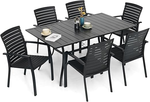 7 Pieces Patio Dining Set Outdoor Furniture with 6 Stackable Aluminum/Plastic Chairs and Rectangular Table for Yard, Garden, Porch and Poolside - Black