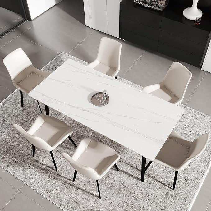 63 inch Marble Sintered Stone Dining Table, Rectangular Modern Dinner Table for 6-Seat with Metal Legs, Restaurant Table for Living Room (Gloss White)