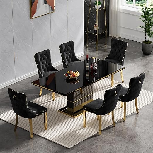 63" Modern Dining Table Set for 6, Luxury 7 Piece Black Gold Kitchen Dining Room Table Set with 6 Black Velvet Upholstered Chairs, High Gloss Wood Dinner Table Set for Dining Room Kitchen